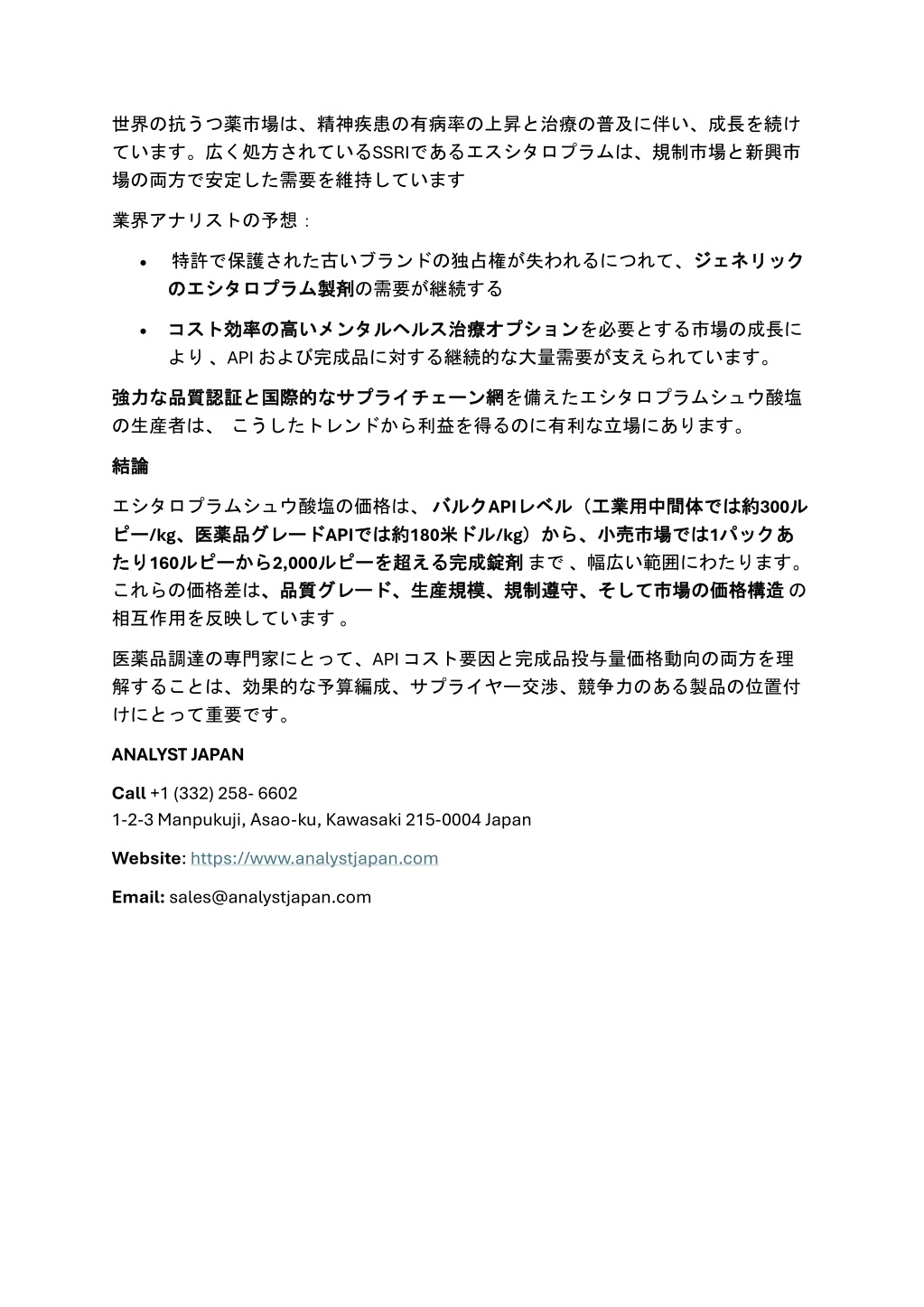 世界の抗うつ薬市場は、精神疾患の有病率の上昇と治療の普及に伴い、成長を続け世界の抗うつ薬市場は、精神疾患の有病率の上昇と治療の普及に伴い、成長を続け ています。広く処方されているSSRIであるエスシタロプラムは、規制市場と新興市 場の両方で安定した需要を維持しています 業界アナリストの予想: •特許で保護された古いブランドの独占権が失われるにつれて、ジェネリック の のエシタロプラム エシタロプラム製剤 製剤の需要が継続する ジェネリック •コスト コスト効率 より、API および完成品に対する継続的な大量需要が支えられています。 効率の の高 高い いメンタルヘルス メンタルヘルス治療 治療オプション オプションを必要とする市場の成長に 強力 強力な の生産者は、こうしたトレンドから利益を得るのに有利な立場にあります。 な品質認証 品質認証と と国際的 国際的な なサプライチェーン サプライチェーン網 網を備えたエシタロプラムシュウ酸塩 結論 結論 エシタロプラムシュウ酸塩の価格は、バルク ピー ピー/kg、医薬品 、医薬品グレード グレードAPIでは たり たり160ルピー ルピーから から2,000ルピー これらの価格差は、 、品質 品質グレード、 相互作用を反映しています。 バルクAPIレベル( 約180米 米ドル ドル/kg)から、 ルピーを を超 超える える完成錠剤 完成錠剤まで、幅広い範囲にわたります。 グレード、生産 生産規模、規制遵守、 規模、規制遵守、そして 約300ル パックあ レベル(工業用中間体 工業用中間体では では約 ル では1パック では約 )から、小売市場 小売市場では あ の価格構造 価格構造の そして市場 市場の 医薬品調達の専門家にとって、API コスト要因と完成品投与量価格動向の両方を理 解することは、効果的な予算編成、サプライヤー交渉、競争力のある製品の位置付 けにとって重要です。 ANALYST JAPAN Call+1 (332) 258- 6602 1-2-3 Manpukuji, Asao-ku, Kawasaki 215-0004 Japan Website:https://www.analystjapan.com Email:sales@analystjapan.com