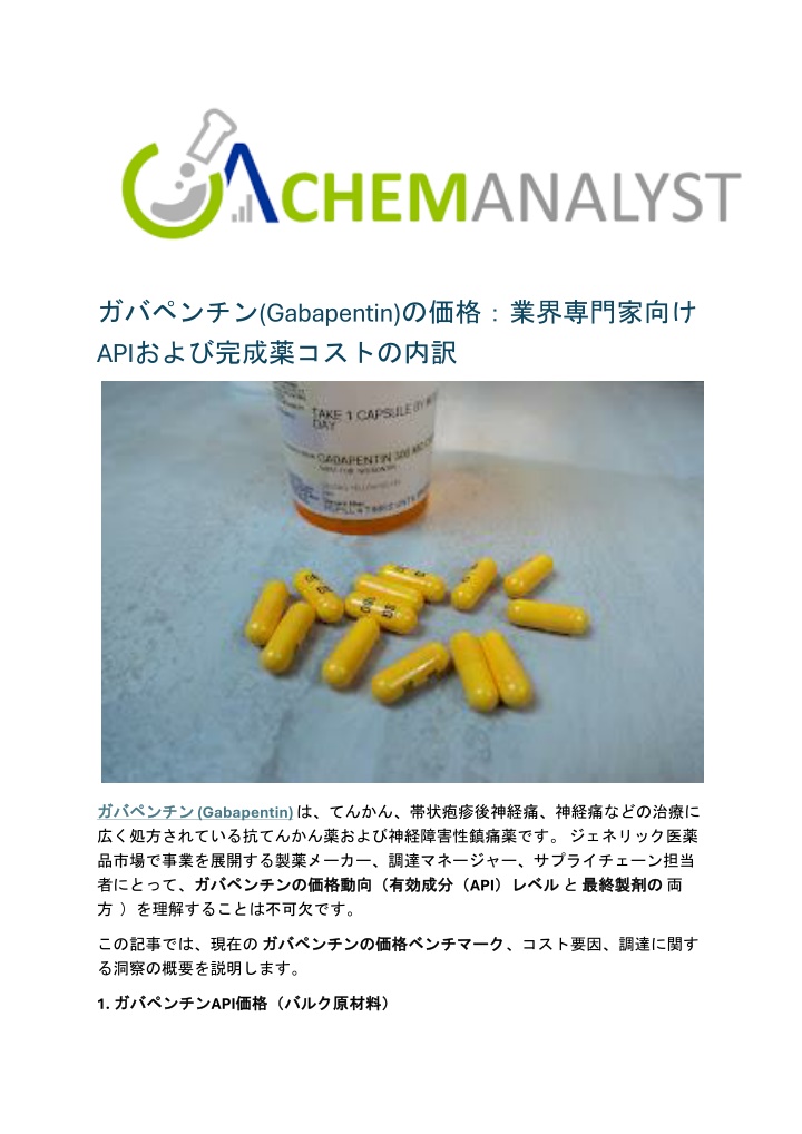 ガバペンチン(Gabapentin)の価格:業界専門家向けガバペンチン(Gabapentin)の価格:業界専門家向け APIおよび完成薬コストの内訳 ガバペンチン ガバペンチン (Gabapentin)は、てんかん、帯状疱疹後神経痛、神経痛などの治療に 広く処方されている抗てんかん薬および神経障害性鎮痛薬です。ジェネリック医薬 品市場で事業を展開する製薬メーカー、調達マネージャー、サプライチェーン担当 価格動向(有効成分(API)レベル 方)を理解することは不可欠です。 )レベルと最終製剤 の両 者にとって、ガバペンチン ガバペンチンの の価格動向(有効成分( 最終製剤の この記事では、現在のガバペンチン る洞察の概要を説明します。 ガバペンチンの の価格 価格ベンチマーク ベンチマーク、コスト要因、調達に関す 1. ガバペンチン ガバペンチンAPI価格( バルク原材料) 原材料) 価格(バルク