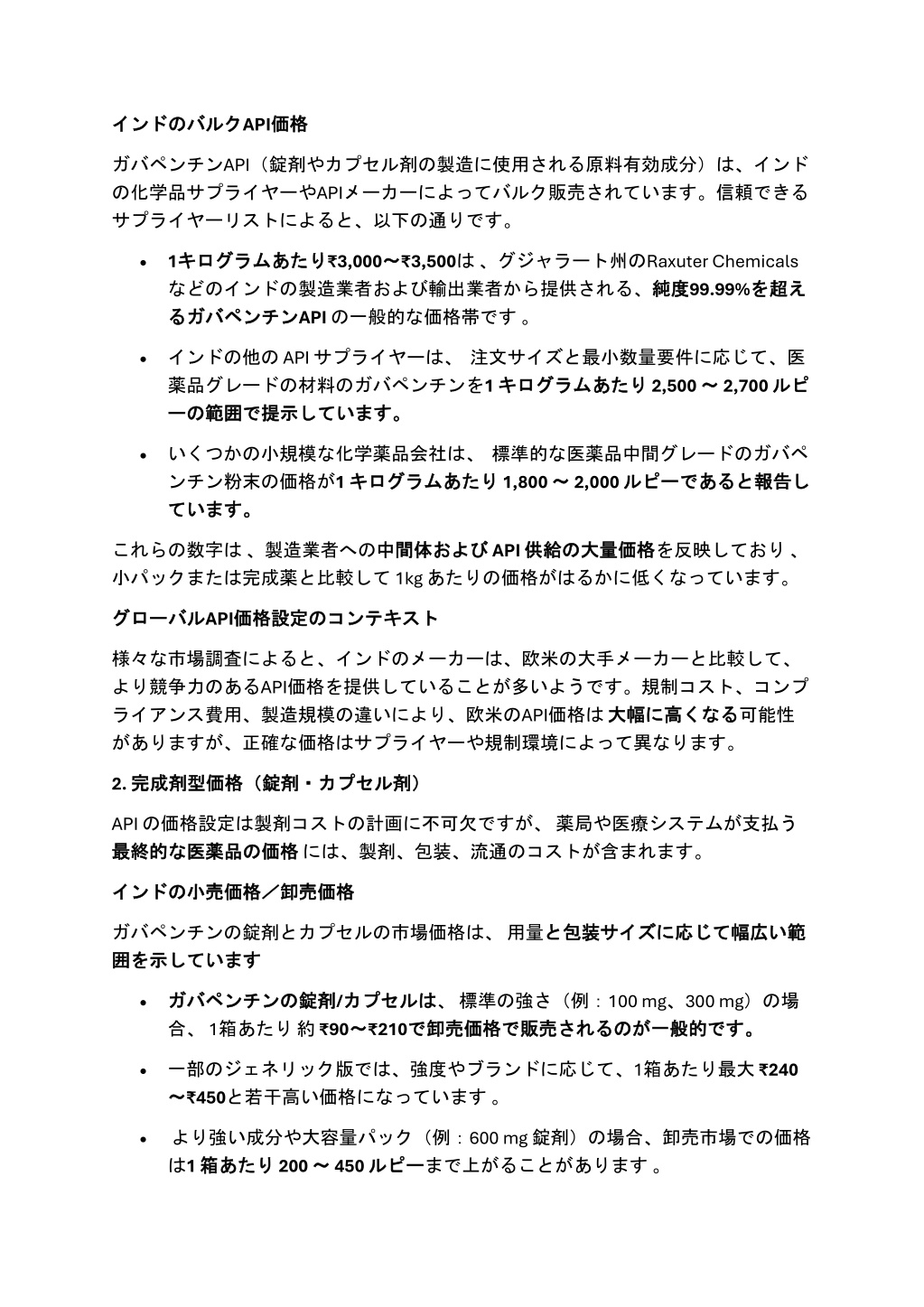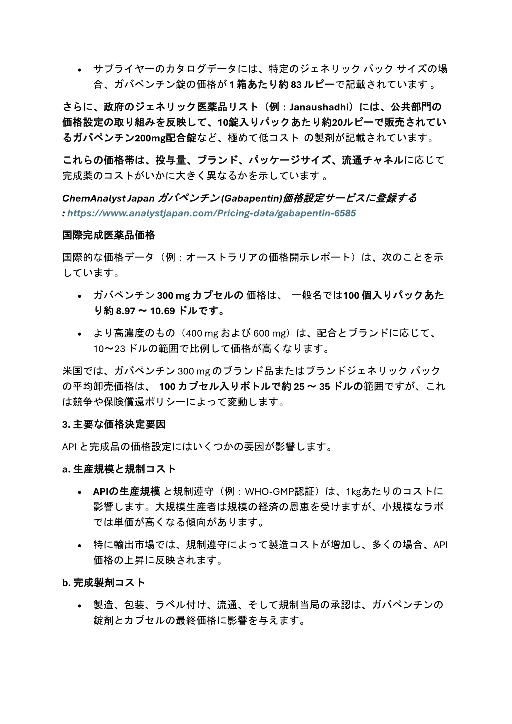 •サプライヤーのカタログデータには、特定のジェネリックパックサイズの場•サプライヤーのカタログデータには、特定のジェネリックパックサイズの場 合、ガバペンチン錠の価格が1 箱 箱あたり あたり約 約 83 ルピー ルピーで記載されています。 例:Janaushadhi)には、 りパック パックあたり あたり約 さらに、 さらに、政府 政府の のジェネリック ジェネリック医薬品 医薬品リスト( リスト(例: して、10錠入 錠入り 配合錠など、極めて低コストの製剤が記載されています。 )には、公共部門 約20ルピー ルピーで で販売 公共部門の の 価格設定 価格設定の ガバペンチン200mg配合錠 の取 取り り組 組みを みを反映 反映して、 販売されてい されてい る るガバペンチン これらの これらの価格帯 完成薬のコストがいかに大きく異なるかを示しています。 価格帯は、 は、投与量、 投与量、ブランド、パッケージサイズ、 ブランド、パッケージサイズ、流通 流通チャネル チャネルに応じて ChemAnalyst Japanガバペンチン :https://www.analystjapan.com/Pricing-data/gabapentin-6585 ガバペンチン (Gabapentin)価格設定 価格設定サービス サービスに に登録 登録する する 国際完成医薬品価格 国際完成医薬品価格 国際的な価格データ(例:オーストラリアの価格開示レポート)は、次のことを示 しています。 •ガバペンチン300 mg カプセル り り約 約 8.97 ~ ~ 10.69 ドル の価格は、一般名では100 個入 カプセルの です。 個入り りパック パックあた あた ドルです。 •より高濃度のもの(400 mg および 600 mg)は、配合とブランドに応じて、 10~23 ドルの範囲で比例して価格が高くなります。 米国では、ガバペンチン 300 mg のブランド品またはブランドジェネリックパック の平均卸売価格は、100 カプセル カプセル入 入り りボトル ボトルで は競争や保険償還ポリシーによって変動します。 約 25 ~ ~ 35 ドル で約 ドルの の範囲ですが、これ 3. 主要 主要な な価格決定要因 価格決定要因 API と完成品の価格設定にはいくつかの要因が影響します。 a. 生産規模 生産規模と コスト と規制 規制コスト •APIの 影響します。大規模生産者は規模の経済の恩恵を受けますが、小規模なラボ では単価が高くなる傾向があります。 の生産規模 生産規模と規制遵守(例:WHO-GMP認証)は、1kgあたりのコストに •特に輸出市場では、規制遵守によって製造コストが増加し、多くの場合、API 価格の上昇に反映されます。 b. 完成製剤 完成製剤コスト コスト •製造、包装、ラベル付け、流通、そして規制当局の承認は、ガバペンチンの 錠剤とカプセルの最終価格に影響を与えます。