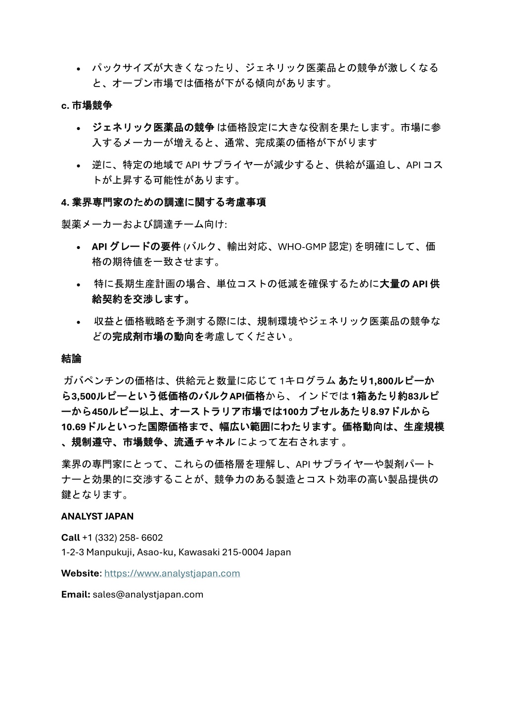 •パックサイズが大きくなったり、ジェネリック医薬品との競争が激しくなる•パックサイズが大きくなったり、ジェネリック医薬品との競争が激しくなる と、オープン市場では価格が下がる傾向があります。 c. 市場競争 市場競争 の競争 競争は価格設定に大きな役割を果たします。市場に参 •ジェネリック ジェネリック医薬品 入するメーカーが増えると、通常、完成薬の価格が下がります 医薬品の •逆に、特定の地域で API サプライヤーが減少すると、供給が逼迫し、API コス トが上昇する可能性があります。 4. 業界専門家 業界専門家のための 関する する考慮事項 考慮事項 のための調達 調達に に関 製薬メーカーおよび調達チーム向け: •API グレード グレードの 格の期待値を一致させます。 の要件 要件(バルク、輸出対応、WHO-GMP 認定) を明確にして、価 •特に長期生産計画の場合、単位コストの低減を確保するために大量 給契約 給契約を を交渉 交渉します。 します。 の API 供 大量の 供 •収益と価格戦略を予測する際には、規制環境やジェネリック医薬品の競争な どの完成剤市場 完成剤市場の の動向 動向を を考慮してください。 結論 結論 ガバペンチンの価格は、供給元と数量に応じて1キログラムあたり ら ら3,500ルピー ルピーという という低価格 低価格の のバルク バルクAPI価格 ーから ーから450ルピー ルピー以上、 以上、オーストラリア オーストラリア市場 10.69ドル ドルといった といった国際価格 国際価格まで、 まで、幅広 、規制遵守、市場競争、流通 、規制遵守、市場競争、流通チャネル チャネルによって左右されます。 あたり1,800ルピー 箱あたり あたり約 あたり8.97ドル 価格動向は、 ルピーか 約83ルピ ドルから から か 価格から、インドでは1箱 市場では では100カプセル カプセルあたり 幅広い い範囲 範囲にわたります。 にわたります。価格動向 ルピ は、生産規模 生産規模 業界の専門家にとって、これらの価格層を理解し、API サプライヤーや製剤パート ナーと効果的に交渉することが、競争力のある製造とコスト効率の高い製品提供の 鍵となります。 ANALYST JAPAN Call+1 (332) 258- 6602 1-2-3 Manpukuji, Asao-ku, Kawasaki 215-0004 Japan Website:https://www.analystjapan.com Email:sales@analystjapan.com