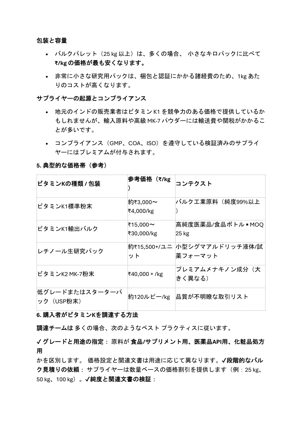 と容量 容量 包装 包装と •バルクパレット(25 kg 以上)は、多くの場合、小さなキロパックに比べて ₹/kg の の価格 価格が が最 最も も安 安くなります。 くなります。 •非常に小さな研究用パックは、梱包と認証にかかる諸経費のため、1kg あた りのコストが高くなります。 とコンプライアンス コンプライアンス サプライヤー サプライヤーの の起源 起源と •地元のインドの販売業者はビタミン K1 を競争力のある価格で提供しているか もしれませんが、輸入原料や高級 MK-7 パウダーには輸送費や関税がかかるこ とが多いです。 •コンプライアンス(GMP、COA、ISO)を遵守している検証済みのサプライ ヤーにはプレミアムが付与されます。 5. 典型的 典型的な な価格帯(参考) 価格帯(参考) 参考価格( 参考価格(₹/kg ) ) ビタミン ビタミンKの の種類 種類 / 包装 包装 コンテクスト コンテクスト バルク工業原料(純度99%以上 ) 約₹3,000~ ₹4,000/kg ビタミンK1標準粉末 ₹15,000~ ₹30,000/kg 高純度医薬品/食品ボトル ▪ MOQ 25 kg ビタミンK1輸出バルク 約₹15,500+/ユニ ット 小型シグマアルドリッチ液体/試 薬フォーマット レチノール生研究パック プレミアムメナキノン成分(大 きく異なる) ₹40,000 + /kg ビタミンK2 MK-7粉末 低グレードまたはスターターパ ック(USP粉末) 約120ルピー/kg品質が不明瞭な取引リスト 6. 購入者 購入者が がビタミン ビタミンKを する方法 方法 を調達 調達する は多くの場合、次のようなベストプラクティスに従います。 調達 調達チーム チームは ✔グレード グレードと 用 用 かを区別します。価格設定と関連文書は用途に応じて異なります。✔段階的 ク ク見積 見積りの りの依頼: 依頼:サプライヤーは数量ベースの価格割引を提供します(例:25 kg、 50 kg、100 kg)。✔純度 純度と と関連文書 関連文書の の検証: 検証: の指定: 指定:原料が食品 食品/サプリメント サプリメント用、医薬品 用、医薬品API用 と用途 用途の 用、化粧品処方 、化粧品処方 段階的な なバル バル