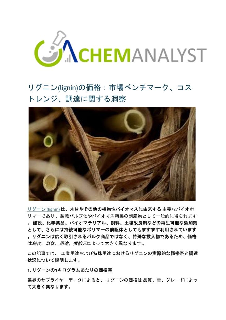 リグニン(lignin)の価格:市場ベンチマーク、コスリグニン(lignin)の価格:市場ベンチマーク、コス トレンジ、調達に関する洞察 リグニン リグニン (lignin)は、 リマーであり、製紙パルプ化やバイオマス精製の副産物として一般的に得られます 。建設、化学薬品、 建設、化学薬品、バイオマテリアル、 バイオマテリアル、飼料、土壌改良剤 飼料、土壌改良剤などの として、さらには として、さらには持続可能 持続可能な なポリマー ポリマーの の前駆体 前駆体としてもますます する主要なバイオポ は、木材 木材やその やその他 他の の植物性 植物性バイオマス バイオマスに に由来 由来する などの再生可能 再生可能な な添加剤 添加剤 としてもますます利用 利用されています されています 。リグニン 。リグニンは は純度、形状、用途、供給元によって大きく異なります。 は広 広く く取引 取引される されるバルク バルク商品 商品ではなく、 ではなく、特殊 特殊な な投入物 投入物であるため、 であるため、価格 価格 は この記事では、工業用途および特殊用途におけるリグニンの実際的 状況 状況について について説明 説明します。 します。 実際的な な価格帯 価格帯と と調達 調達 1. リグニン リグニンの の1キログラム キログラムあたりの 価格帯 あたりの価格帯 業界のサプライヤーデータによると、リグニンの価格は品質、量、グレードによっ て大 大きく きく異 異なります。 なります。