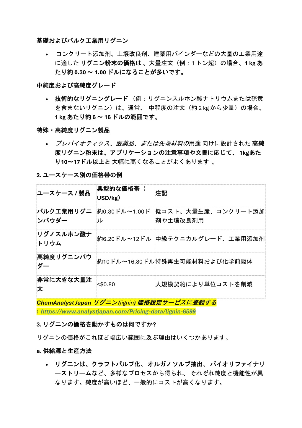 工業用リグニン リグニン 基礎 基礎および およびバルク バルク工業用 •コンクリート添加剤、土壌改良剤、建築用バインダーなどの大量の工業用途 に適したリグニン リグニン粉末 粉末の の価格 価格は、大量注文(例:1 トン超)の場合、1 kg あ たり たり約 約 0.30 ~ ~ 1.00 ドル ドルになることが になることが多 あ 多いです。 いです。 高純度グレード グレード 中純度 中純度および および高純度 なリグニングレード リグニングレード(例:リグニンスルホン酸ナトリウムまたは硫黄 •技術的 技術的な を含まないリグニン)は、通常、中程度の注文(約 2 kg から少量)の場合、 1 kg あたり あたり約 約 6 ~ ~ 16 ドル ドルの の範囲 範囲です。 です。 製品 特殊・高純度 特殊・高純度リグニン リグニン製品 •プレバイオティクス、医薬品、または先端材料の用途向けに設計された高純 度 度リグニン リグニン粉末 粉末は、 は、アプリケーション アプリケーションの り10~ ~17ドル ドル以上 以上と と大幅に高くなることがよくあります。 高純 応じて、 じて、1kgあた の注意事項 注意事項や や文書 文書に に応 あた り 2. ユースケース ユースケース別 例 別の の価格帯 価格帯の の例 典型的 典型的な USD/kg) な価格帯( 価格帯( ) ユースケース ユースケース / 製品 製品 注記 注記 約0.30ドル~1.00ド ル バルク バルク工業用 ンパウダー 工業用リグニ リグニ 低コスト、大量生産、コンクリート添加 剤や土壌改良剤用 ンパウダー リグノスルホン リグノスルホン酸 トリウム 酸ナ ナ 約6.20ドル~12ドル中級テクニカルグレード、工業用添加剤 トリウム 高純度 高純度リグニンパウ リグニンパウ ダー ダー 約10ドル~16.80ドル特殊再生可能材料および化学前駆体 非常 非常に 文 に大 大きな きな大量注 大量注 <$0.80 大規模契約により単位コストを削減 文 ChemAnalyst Japanリグニン :https://www.analystjapan.com/Pricing-data/lignin-6599 リグニン (lignin)価格設定 価格設定サービス サービスに に登録 登録する する 3. リグニン リグニンの 何ですか ですか? の価格 価格を を動 動かすものは かすものは何 リグニンの価格がこれほど幅広い範囲に及ぶ理由はいくつかあります。 a. 供給源 供給源と と生産方法 生産方法 化、オルガノソルブ オルガノソルブ抽出 抽出、バイオリファイナリ バイオリファイナリ •リグニン リグニンは、 ーストリーム ーストリームなど、多様なプロセスから得られ、それぞれ純度と機能性が異 なります。純度が高いほど、一般的にコストが高くなります。 は、クラフトパルプ クラフトパルプ化