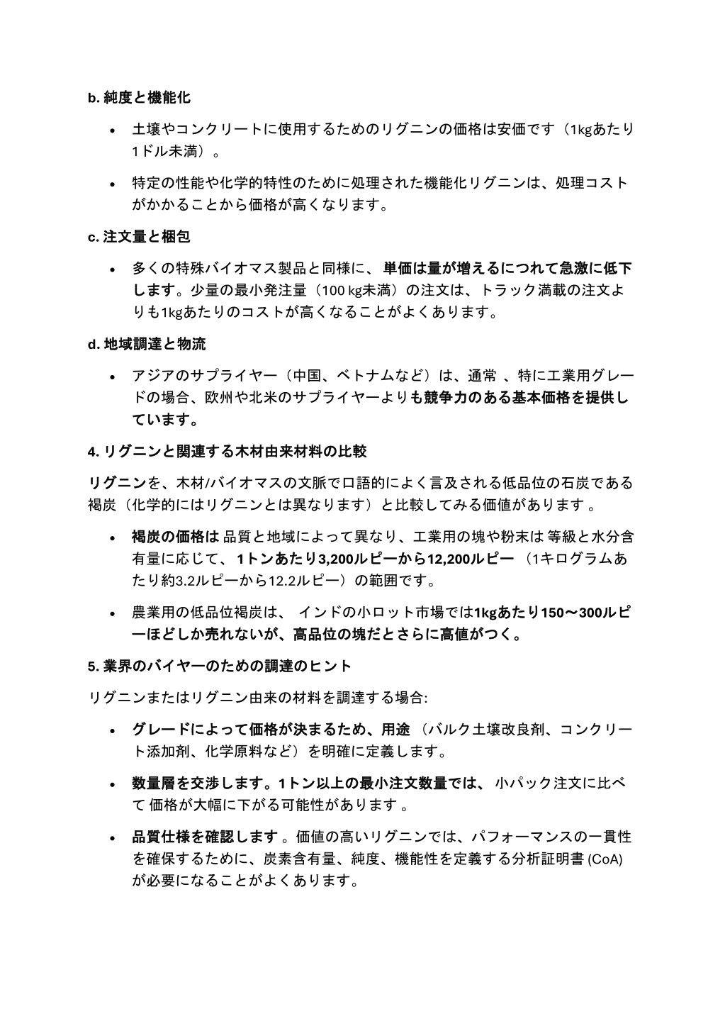 b. 純度 純度と と機能化 機能化 •土壌やコンクリートに使用するためのリグニンの価格は安価です(1kgあたり 1ドル未満)。 •特定の性能や化学的特性のために処理された機能化リグニンは、処理コスト がかかることから価格が高くなります。 c. 注文量 注文量と と梱包 梱包 •多くの特殊バイオマス製品と同様に、単価 します します。少量の最小発注量(100 kg未満)の注文は、トラック満載の注文よ りも1kgあたりのコストが高くなることがよくあります。 単価は は量 量が が増 増えるにつれて えるにつれて急激 急激に に低下 低下 d. 地域調達 地域調達と と物流 物流 •アジアのサプライヤー(中国、ベトナムなど)は、通常、特に工業用グレー ドの場合、欧州や北米のサプライヤーよりも ています。 も競争力 競争力のある のある基本価格 基本価格を を提供 提供し し ています。 4. リグニン リグニンと の比較 比較 と関連 関連する する木材由来材料 木材由来材料の リグニン リグニンを、木材/バイオマスの文脈で口語的によく言及される低品位の石炭である 褐炭(化学的にはリグニンとは異なります)と比較してみる価値があります。 は品質と地域によって異なり、工業用の塊や粉末は等級と水分含 トンあたり あたり3,200ルピー ルピーから から12,200ルピー •褐炭 褐炭の 有量に応じて、1トン たり約3.2ルピーから12.2ルピー)の範囲です。 の価格 価格は ルピー(1キログラムあ •農業用の低品位褐炭は、インドの小ロット市場では1kgあたり ーほどしか ーほどしか売 売れないが、 れないが、高品位 高品位の あたり150~ がつく。 ~300ルピ ルピ の塊 塊だとさらに だとさらに高値 高値がつく。 5. 業界 業界の のヒント ヒント のバイヤー バイヤーのための のための調達 調達の リグニンまたはリグニン由来の材料を調達する場合: 用途(バルク土壌改良剤、コンクリー •グレード グレードによって ト添加剤、化学原料など)を明確に定義します。 によって価格 価格が が決 決まるため、 まるため、用途 を交渉 交渉します。 します。1トン では、小パック注文に比べ •数量層 数量層を て価格が大幅に下がる可能性があります。 トン以上 以上の の最小注文数量 最小注文数量では、 します。価値の高いリグニンでは、パフォーマンスの一貫性 •品質仕様 品質仕様を を確保するために、炭素含有量、純度、機能性を定義する分析証明書 (CoA) が必要になることがよくあります。 を確認 確認します