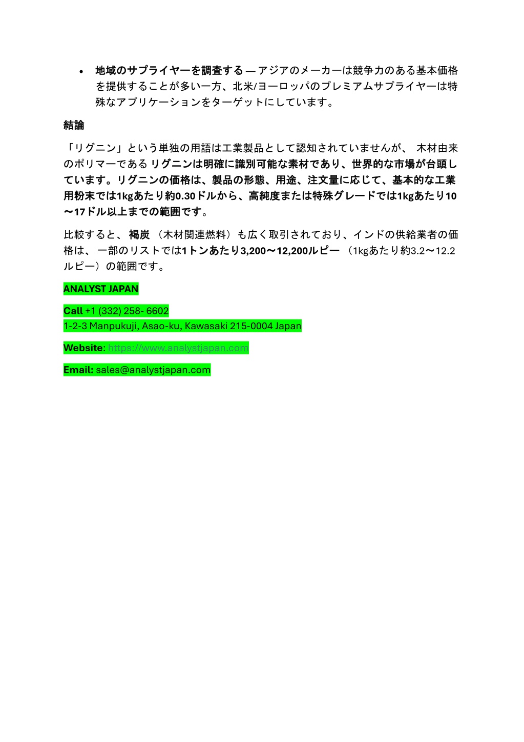 する— アジアのメーカーは競争力のある基本価格 •地域 地域の を提供することが多い一方、北米/ヨーロッパのプレミアムサプライヤーは特 殊なアプリケーションをターゲットにしています。 のサプライヤー サプライヤーを を調査 調査する 結論 結論 「リグニン」という単独の用語は工業製品として認知されていませんが、木材由来 のポリマーであるリグニン リグニンは は明確 明確に に識別可能 識別可能な ています。 ています。リグニン リグニンの の価格 価格は、 は、製品 製品の の形態、用途、注文量 形態、用途、注文量に では1kgあたり あたり約 約0.30ドル ドルから、 から、高純度 高純度または ~ ~17ドル ドル以上 以上までの までの範囲 範囲です です。 な素材 素材であり、 であり、世界的 世界的な な市場 市場が が台頭 台頭し し に応 応じて、 じて、基本的 では1kgあたり 基本的な な工業 工業 あたり10 用粉末 用粉末では または特殊 特殊グレード グレードでは 比較すると、褐炭 格は、一部のリストでは1トン ルピー)の範囲です。 褐炭(木材関連燃料)も広く取引されており、インドの供給業者の価 トンあたり あたり3,200~ ~12,200ルピー ルピー(1kgあたり約3.2~12.2 ANALYST JAPAN Call+1 (332) 258- 6602 1-2-3 Manpukuji, Asao-ku, Kawasaki 215-0004 Japan Website:https://www.analystjapan.com Email:sales@analystjapan.com
