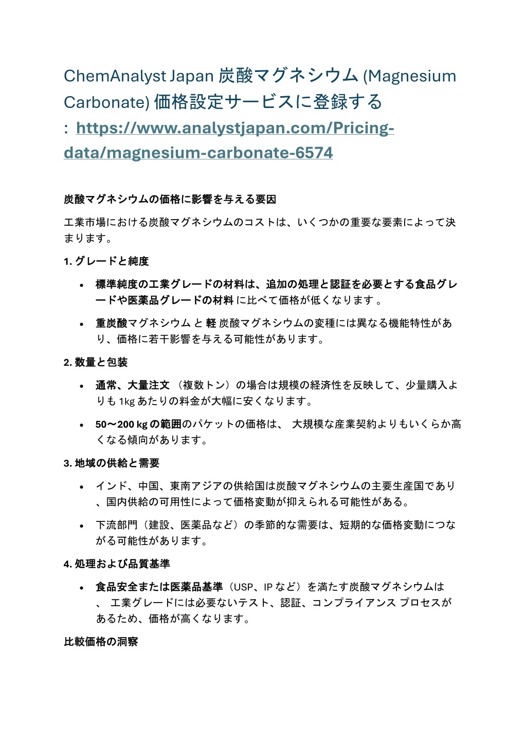 ChemAnalyst Japan炭酸マグネシウム (Magnesium Carbonate)価格設定サービスに登録する :https://www.analystjapan.com/Pricing- data/magnesium-carbonate-6574 要因 炭酸 炭酸マグネシウム マグネシウムの の価格 価格に に影響 影響を を与 与える える要因 工業市場における炭酸マグネシウムのコストは、いくつかの重要な要素によって決 まります。 1.グレード グレードと と純度 純度 •標準純度 標準純度の ード ードや の工業 工業グレード グレードの の材料 材料は、 材料に比べて価格が低くなります。 は、追加 追加の の処理 処理と と認証 認証を を必要 必要とする とする食品 食品グレ グレ や医薬品 医薬品グレード グレードの の材料 •重炭酸 重炭酸マグネシウムと軽 り、価格に若干影響を与える可能性があります。 軽炭酸マグネシウムの変種には異なる機能特性があ 2.数量 数量と と包装 包装 •通常、大量注文 通常、大量注文(複数トン)の場合は規模の経済性を反映して、少量購入よ りも 1kg あたりの料金が大幅に安くなります。 •50~ くなる傾向があります。 ~200 kg の の範囲 範囲のパケットの価格は、大規模な産業契約よりもいくらか高 3.地域 地域の と需要 需要 の供給 供給と •インド、中国、東南アジアの供給国は炭酸マグネシウムの主要生産国であり 、国内供給の可用性によって価格変動が抑えられる可能性がある。 •下流部門(建設、医薬品など)の季節的な需要は、短期的な価格変動につな がる可能性があります。 4.処理 処理および および品質基準 品質基準 または医薬品基準 医薬品基準(USP、IP など)を満たす炭酸マグネシウムは •食品安全 食品安全または 、工業グレードには必要ないテスト、認証、コンプライアンスプロセスが あるため、価格が高くなります。 の洞察 洞察 比較価格 比較価格の