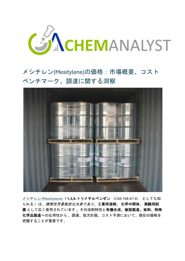 メシチレン(Mesitylene)の価格:市場概要、コストメシチレン(Mesitylene)の価格:市場概要、コスト ベンチマーク、調達に関する洞察 メシチレン メシチレン (Mesitylene)( られる)は、揮発性芳香族炭化水素であり、工業用溶剤 薬 薬として広く使用されています。その溶剤特性と有機合成、樹脂製造、染料、特殊 化学品製造 化学品製造への応用性から、調達、処方計画、コスト予測において、現在の価格を 把握することが重要です。 (1,3,5-トリメチルベンゼン トリメチルベンゼン(CAS 108-67-8)としても知 工業用溶剤、化学中間体 有機合成、樹脂製造、染料、特殊 化学中間体、実験用試 実験用試