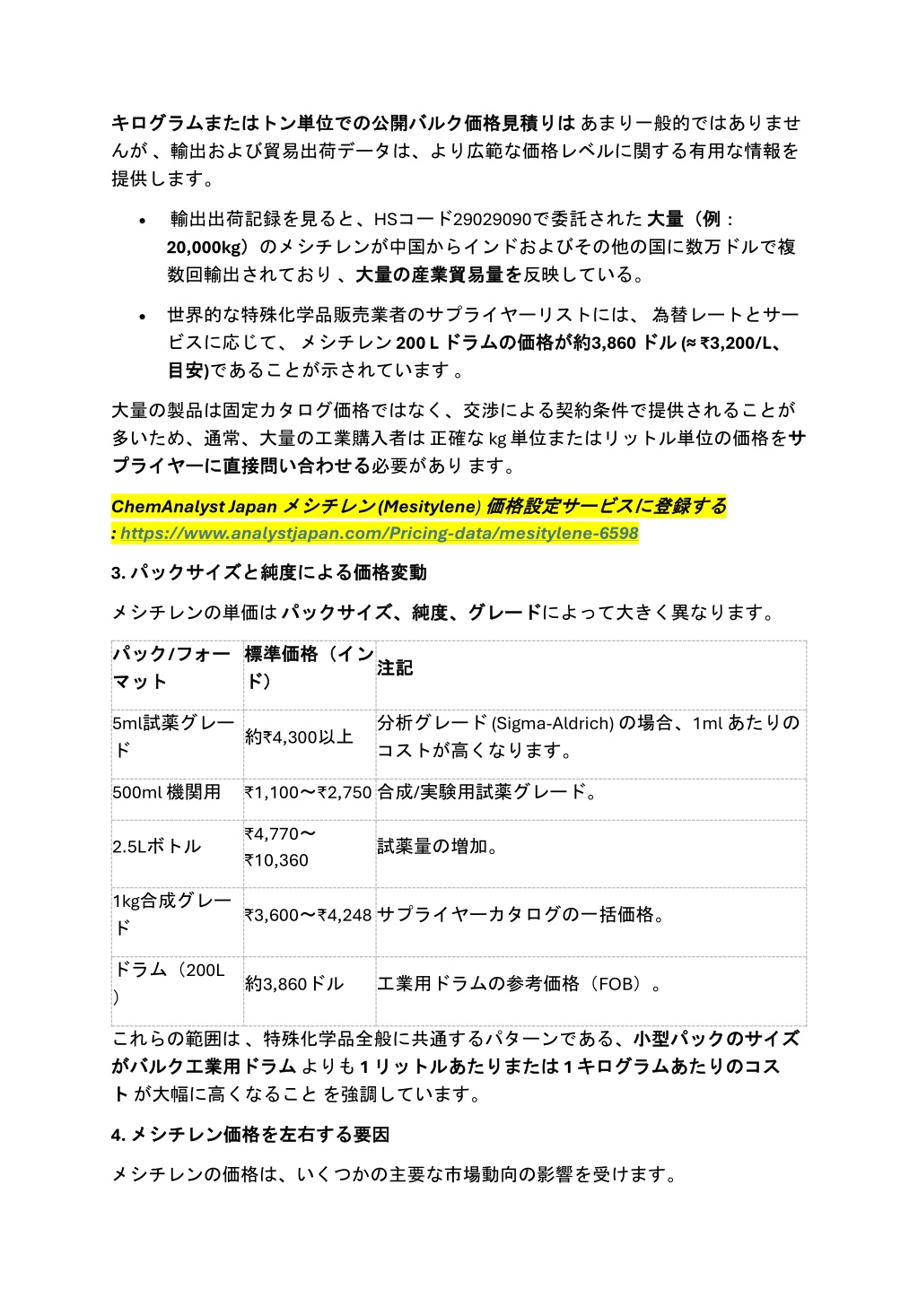 りはあまり一般的ではありませ キログラム キログラムまたは んが、輸出および貿易出荷データは、より広範な価格レベルに関する有用な情報を 提供します。 またはトン トン単位 単位での での公開 公開バルク バルク価格見積 価格見積りは •輸出出荷記録を見ると、HSコード29029090で委託された大量(例: 20,000kg) )のメシチレンが中国からインドおよびその他の国に数万ドルで複 数回輸出されており、大量 大量の の産業貿易量 産業貿易量を 大量(例: を反映している。 •世界的な特殊化学品販売業者のサプライヤーリストには、為替レートとサー ビスに応じて、メシチレン200 L ドラム ドラムの 目安 目安)であることが示されています。 約3,860 ドル ドル (≈ ₹3,200/L、 の価格 価格が が約 、 大量の製品は固定カタログ価格ではなく、交渉による契約条件で提供されることが 多いため、通常、大量の工業購入者は正確な kg 単位またはリットル単位の価格をサ プライヤー プライヤーに に直接問 直接問い い合 合わせる わせる必要があります。 サ ChemAnalyst Japanメシチレン :https://www.analystjapan.com/Pricing-data/mesitylene-6598 メシチレン (Mesitylene)価格設定 価格設定サービス サービスに に登録 登録する する 3. パックサイズ パックサイズと 価格変動 と純度 純度による による価格変動 メシチレンの単価はパックサイズ、 純度、グレード グレードによって大きく異なります。 パックサイズ、純度、 パック パック/フォー マット マット フォー 標準価格( 標準価格(イン ド) イン 注記 注記 ド) 5ml試薬グレー ド 分析グレード (Sigma-Aldrich) の場合、1ml あたりの コストが高くなります。 約₹4,300以上 500ml 機関用 ₹1,100~₹2,750合成/実験用試薬グレード。 ₹4,770~ ₹10,360 2.5Lボトル 試薬量の増加。 1kg合成グレー ド ₹3,600~₹4,248サプライヤーカタログの一括価格。 ドラム(200L ) 約3,860ドル 工業用ドラムの参考価格(FOB)。 これらの範囲は、特殊化学品全般に共通するパターンである、小型 が がバルク バルク工業用 工業用ドラム ドラムよりも1 リットル リットルあたりまたは ト トが大幅に高くなることを強調しています。 小型パック パックの のサイズ サイズ あたりまたは 1 キログラム キログラムあたりの あたりのコス コス 4. メシチレン メシチレン価格 要因 価格を を左右 左右する する要因 メシチレンの価格は、いくつかの主要な市場動向の影響を受けます。