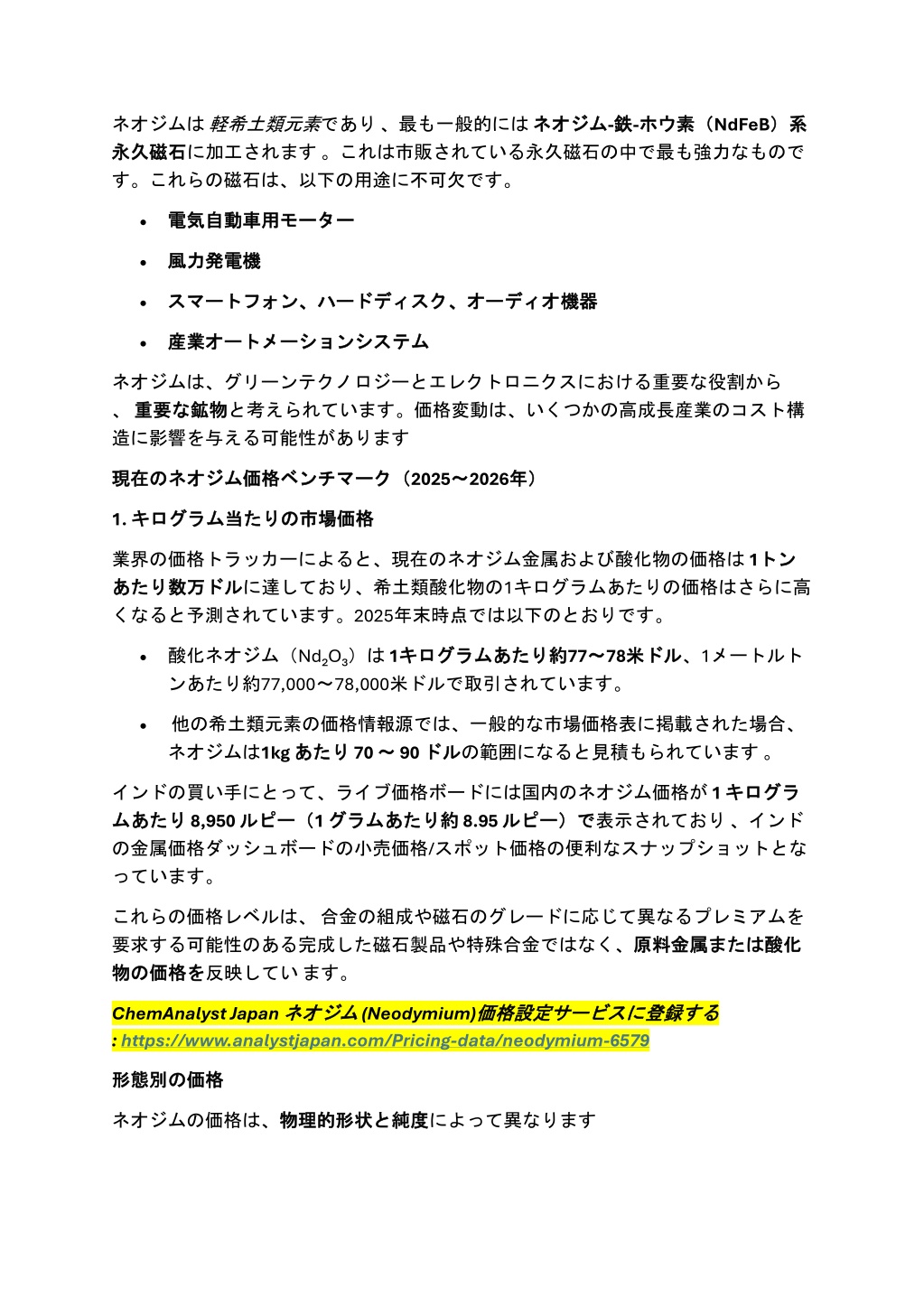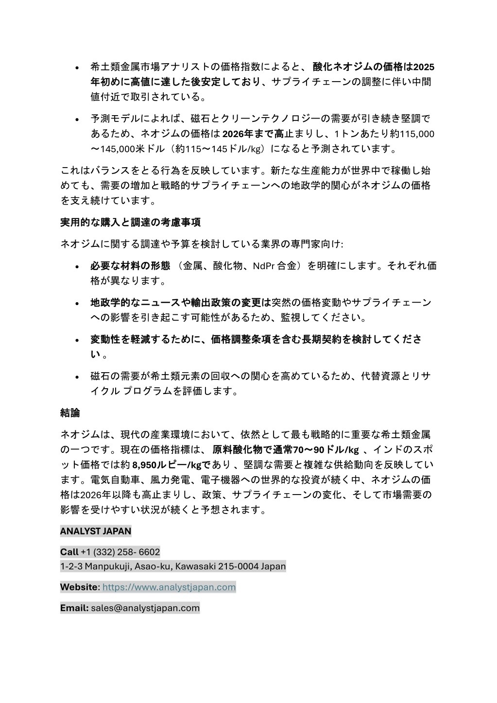 •希土類金属市場アナリストの価格指数によると、酸化•希土類金属市場アナリストの価格指数によると、酸化 年初 年初めに めに高値 高値に に達 達した した後安定 後安定しており 値付近で取引されている。 は2025 酸化ネオジム ネオジムの の価格 価格は しており、サプライチェーンの調整に伴い中間 •予測モデルによれば、磁石とクリーンテクノロジーの需要が引き続き堅調で あるため、ネオジムの価格は2026年 年まで ~145,000米ドル(約115~145ドル/kg)になると予測されています。 高止まりし、1トンあたり約115,000 まで高 これはバランスをとる行為を反映しています。新たな生産能力が世界中で稼働し始 めても、需要の増加と戦略的サプライチェーンへの地政学的関心がネオジムの価格 を支え続けています。 の考慮事項 考慮事項 実用的 実用的な な購入 購入と と調達 調達の ネオジムに関する調達や予算を検討している業界の専門家向け: の形態 形態(金属、酸化物、NdPr 合金)を明確にします。それぞれ価 •必要 必要な 格が異なります。 な材料 材料の •地政学的 地政学的な への影響を引き起こす可能性があるため、監視してください。 なニュース ニュースや や輸出政策 輸出政策の の変更 変更は は突然の価格変動やサプライチェーン •変動性 変動性を い い。 を軽減 軽減するために、 するために、価格調整条項 価格調整条項を を含 含む む長期契約 長期契約を を検討 検討してくださ してくださ •磁石の需要が希土類元素の回収への関心を高めているため、代替資源とリサ イクルプログラムを評価します。 結論 結論 ネオジムは、現代の産業環境において、依然として最も戦略的に重要な希土類金属 の一つです。現在の価格指標は、原料酸化物 原料酸化物で ット価格では約8,950ルピー ルピー/kgで であり、堅調な需要と複雑な供給動向を反映してい ます。電気自動車、風力発電、電子機器への世界的な投資が続く中、ネオジムの価 格は2026年以降も高止まりし、政策、サプライチェーンの変化、そして市場需要の 影響を受けやすい状況が続くと予想されます。 で通常 通常70~ ~90ドル ドル/kg、インドのスポ ANALYST JAPAN Call+1 (332) 258- 6602 1-2-3 Manpukuji, Asao-ku, Kawasaki 215-0004 Japan Website:https://www.analystjapan.com Email:sales@analystjapan.com