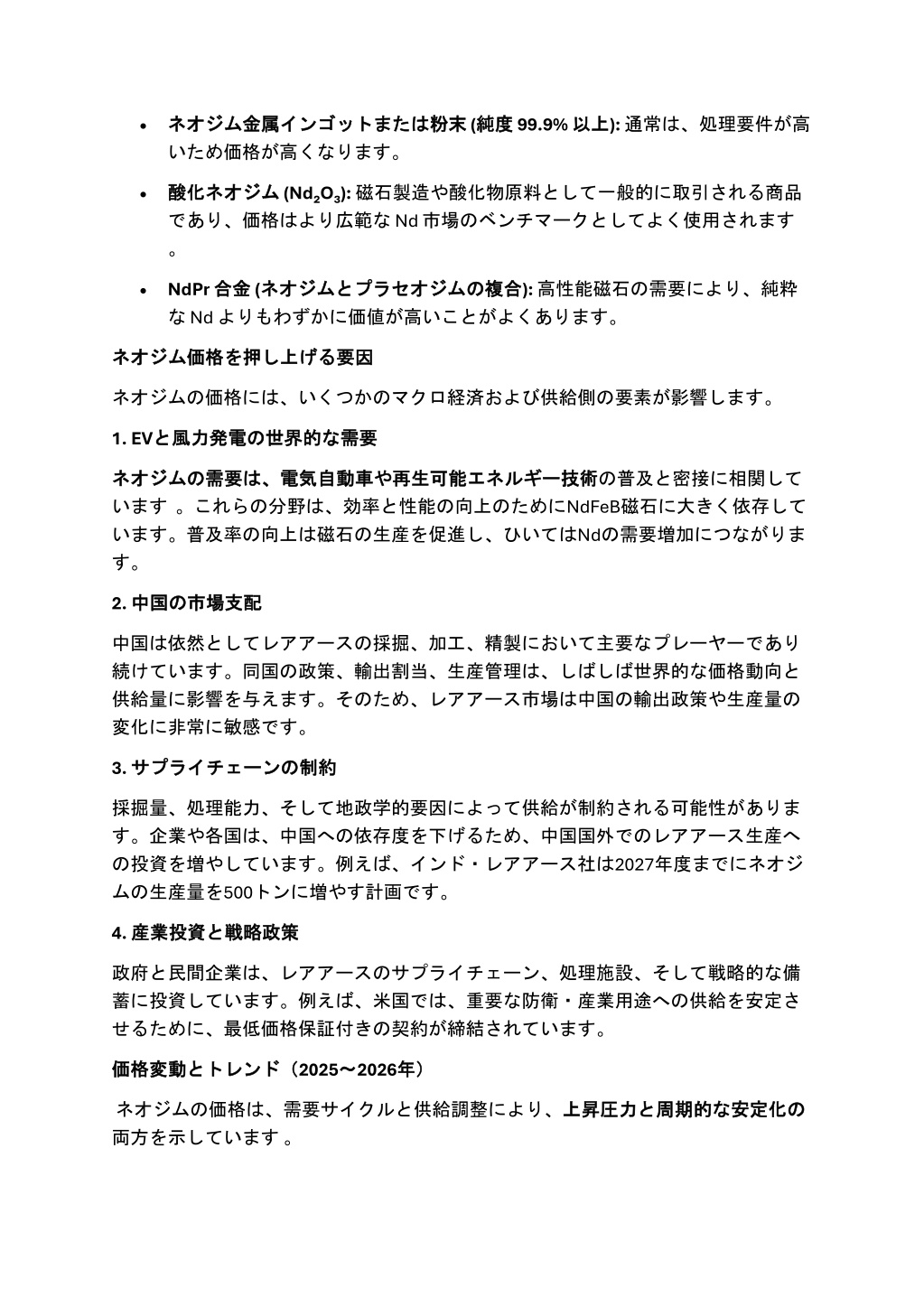 粉末 (純度 純度 99.9% 以上 以上):通常は、処理要件が高 •ネオジム ネオジム金属 いため価格が高くなります。 金属インゴット インゴットまたは または粉末 •酸化 酸化ネオジム ネオジム (Nd₂O₃):磁石製造や酸化物原料として一般的に取引される商品 であり、価格はより広範な Nd 市場のベンチマークとしてよく使用されます 。 •NdPr 合金 な Nd よりもわずかに価値が高いことがよくあります。 合金 (ネオジム ネオジムと の複合 複合):高性能磁石の需要により、純粋 とプラセオジム プラセオジムの 要因 ネオジム ネオジム価格 価格を を押 押し し上 上げる げる要因 ネオジムの価格には、いくつかのマクロ経済および供給側の要素が影響します。 1. EVと な需要 需要 と風力発電 風力発電の の世界的 世界的な ネオジム ネオジムの います。これらの分野は、効率と性能の向上のためにNdFeB磁石に大きく依存して います。普及率の向上は磁石の生産を促進し、ひいてはNdの需要増加につながりま す。 の需要 需要は、 は、電気自動車 電気自動車や や再生可能 再生可能エネルギー エネルギー技術 技術の普及と密接に相関して 2. 中国 中国の の市場支配 市場支配 中国は依然としてレアアースの採掘、加工、精製において主要なプレーヤーであり 続けています。同国の政策、輸出割当、生産管理は、しばしば世界的な価格動向と 供給量に影響を与えます。そのため、レアアース市場は中国の輸出政策や生産量の 変化に非常に敏感です。 3. サプライチェーン サプライチェーンの の制約 制約 採掘量、処理能力、そして地政学的要因によって供給が制約される可能性がありま す。企業や各国は、中国への依存度を下げるため、中国国外でのレアアース生産へ の投資を増やしています。例えば、インド・レアアース社は2027年度までにネオジ ムの生産量を500トンに増やす計画です。 4. 産業投資 産業投資と と戦略政策 戦略政策 政府と民間企業は、レアアースのサプライチェーン、処理施設、そして戦略的な備 蓄に投資しています。例えば、米国では、重要な防衛・産業用途への供給を安定さ せるために、最低価格保証付きの契約が締結されています。 とトレンド( トレンド(2025~ ~2026年) 年) 価格変動 価格変動と ネオジムの価格は、需要サイクルと供給調整により、上昇圧力 両方を示しています。 上昇圧力と と周期的 周期的な な安定化 安定化の の