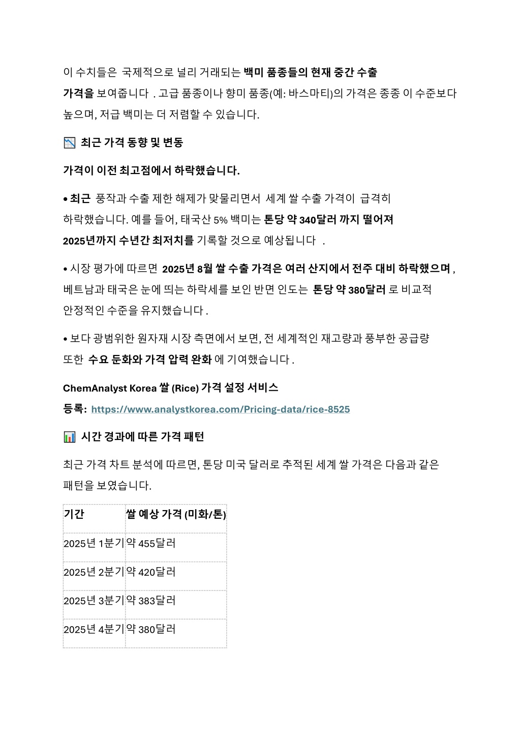 2. 이수치들은국제적으로널리거래되는백미품종들의현재중간수출이수치들은국제적으로널리거래되는백미품종들의현재중간수출 가격을보여줍니다. 고급품종이나향미품종(예: 바스마티)의가격은종종이수준보다 높으며, 저급백미는더저렴할수있습니다. 최근가격동향및변동 가격이이전최고점에서하락했습니다. • 최근풍작과수출제한해제가맞물리면서세계쌀수출가격이급격히 하락했습니다. 예를들어, 태국산 5% 백미는톤당약 340달러까지떨어져 2025년까지수년간최저치를기록할것으로예상됩니다. • 시장평가에따르면2025년 8월쌀수출가격은여러산지에서전주대비하락했으며, 베트남과태국은눈에띄는하락세를보인반면인도는톤당약 380달러로비교적 안정적인수준을유지했습니다 . • 보다광범위한원자재시장측면에서보면, 전세계적인재고량과풍부한공급량 또한수요둔화와가격압력완화에기여했습니다 . ChemAnalyst Korea 쌀 (Rice)가격설정서비스 등록:https://www.analystkorea.com/Pricing-data/rice-8525 시간경과에따른가격패턴 최근가격차트분석에따르면, 톤당미국달러로추적된세계쌀가격은다음과같은 패턴을보였습니다. 기간 쌀예상가격 (미화/톤) 2025년 1분기약 455달러 2025년 2분기약 420달러 2025년 3분기약 383달러 2025년 4분기약 380달러