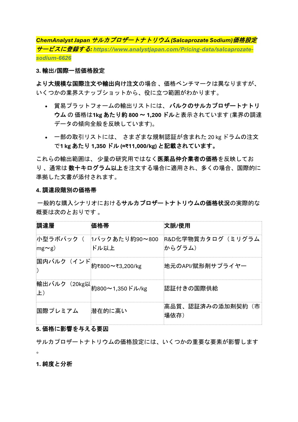 ChemAnalyst Japanサルカプロザートナトリウム サルカプロザートナトリウム (Salcaprozate Sodium)価格設定 サービス サービスに に登録 登録する する:https://www.analystjapan.com/Pricing-data/salcaprozate- sodium-6626 価格設定 3. 輸出 輸出/国際一括価格設定 国際一括価格設定 け注文 注文の場合、価格ベンチマークは異なりますが、 より より大規模 大規模な いくつかの業界スナップショットから、役に立つ範囲がわかります。 な国際注文 国際注文や や輸出向 輸出向け •貿易プラットフォームの輸出リストには、バルク ウム ウムの価格は1kg あたり あたり約 データの傾向全般を反映しています)。 バルクの ドルと表示されています(業界の調達 のサルカプロザートナトリ サルカプロザートナトリ 約 800 ~ ~ 1,200 ドル •一部の取引リストには、さまざまな規制認証が含まれた 20 kg ドラムの注文 で1 kg あたり あたり 1,350 ドル ドル (≈₹11,000/kg) と と記載 記載されています。 されています。 これらの輸出範囲は、少量の研究用ではなく医薬品仲介業者 り、通常は数十 数十キログラム キログラム以上 以上を注文する場合に適用され、多くの場合、国際的に 準拠した文書が添付されます。 医薬品仲介業者の の価格 価格を反映してお 4. 調達段階別 調達段階別の の価格帯 価格帯 一般的な購入シナリオにおけるサルカプロザートナトリウム 概要は次のとおりです。 サルカプロザートナトリウムの の価格状況 価格状況の実際的な 調達層 調達層 価格帯 価格帯 文脈 文脈/使用 使用 1パックあたり約90~800 ドル以上 R&D化学物質カタログ(ミリグラム からグラム) 小型ラボパック( mg~g) 国内バルク(インド ) 約₹800~₹3,200/kg 地元のAPI/賦形剤サプライヤー 輸出バルク(20kg以 上) 約800~1,350ドル/kg 認証付きの国際供給 高品質、認証済みの添加剤契約(市 場依存) 国際プレミアム 潜在的に高い 5. 価格 価格に 要因 に影響 影響を を与 与える える要因 サルカプロザートナトリウムの価格設定には、いくつかの重要な要素が影響します 。 1. 純度 純度と と分析 分析