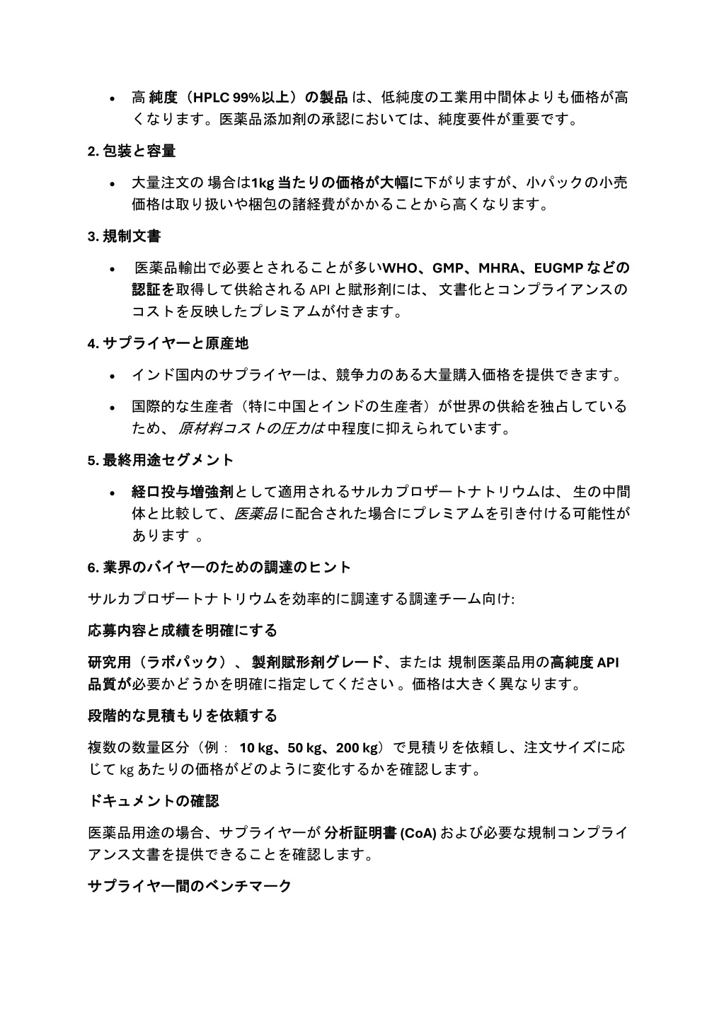 •高純度( 純度(HPLC 99%以上) くなります。医薬品添加剤の承認においては、純度要件が重要です。 の製品 製品は、低純度の工業用中間体よりも価格が高 以上)の 2. 包装 包装と と容量 容量 •大量注文の場合は1kg 当 価格は取り扱いや梱包の諸経費がかかることから高くなります。 当たりの たりの価格 価格が が大幅 大幅に に下がりますが、小パックの小売 3. 規制文書 規制文書 •医薬品輸出で必要とされることが多いWHO、 認証 認証を を取得して供給される API と賦形剤には、文書化とコンプライアンスの コストを反映したプレミアムが付きます。 、GMP、 、MHRA、 、EUGMP などの などの 4. サプライヤー サプライヤーと と原産地 原産地 •インド国内のサプライヤーは、競争力のある大量購入価格を提供できます。 •国際的な生産者(特に中国とインドの生産者)が世界の供給を独占している ため、原材料コストの圧力は中程度に抑えられています。 5. 最終用途 最終用途セグメント セグメント •経口投与増強剤 経口投与増強剤として適用されるサルカプロザートナトリウムは、生の中間 体と比較して、医薬品に配合された場合にプレミアムを引き付ける可能性が あります。 6. 業界 業界の のヒント ヒント のバイヤー バイヤーのための のための調達 調達の サルカプロザートナトリウムを効率的に調達する調達チーム向け: にする 応募内容 応募内容と と成績 成績を を明確 明確にする 研究用( 研究用(ラボパック) ラボパック)、製剤賦形剤 品質 品質が が必要かどうかを明確に指定してください。価格は大きく異なります。 グレード、または規制医薬品用の高純度 高純度 API 製剤賦形剤グレード する 段階的 段階的な な見積 見積もりを もりを依頼 依頼する 複数の数量区分(例:10 kg、 じて kg あたりの価格がどのように変化するかを確認します。 、50 kg、 、200 kg)で見積りを依頼し、注文サイズに応 の確認 確認 ドキュメント ドキュメントの 医薬品用途の場合、サプライヤーが分析証明書 アンス文書を提供できることを確認します。 分析証明書 (CoA)および必要な規制コンプライ のベンチマーク ベンチマーク サプライヤー サプライヤー間 間の