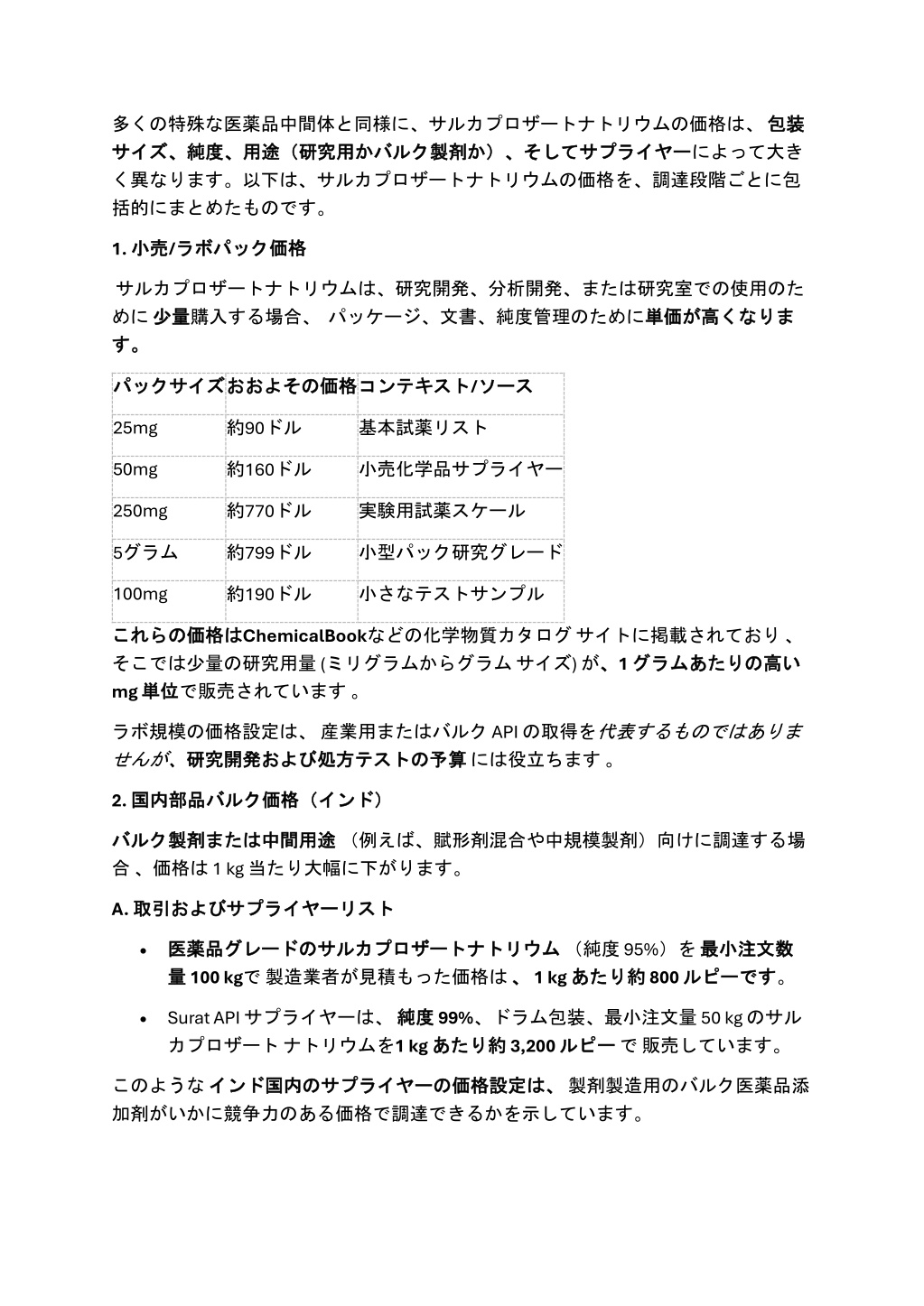 多くの特殊な医薬品中間体と同様に、サルカプロザートナトリウムの価格は、包装多くの特殊な医薬品中間体と同様に、サルカプロザートナトリウムの価格は、包装 サイズ、 サイズ、純度、用途(研究用 純度、用途(研究用か かバルク バルク製剤 製剤か)、そして 包装 か)、そしてサプライヤー サプライヤーによって大き く異なります。以下は、サルカプロザートナトリウムの価格を、調達段階ごとに包 括的にまとめたものです。 1. 小売 小売/ラボパック ラボパック価格 価格 サルカプロザートナトリウムは、研究開発、分析開発、または研究室での使用のた めに少量 少量購入する場合、パッケージ、文書、純度管理のために単価 す。 す。 単価が が高 高くなりま くなりま パックサイズ パックサイズおおよその 価格コンテキスト コンテキスト/ソース ソース おおよその価格 25mg 約90ドル 基本試薬リスト 50mg 約160ドル 小売化学品サプライヤー 250mg 約770ドル 実験用試薬スケール 5グラム 約799ドル 小型パック研究グレード 100mg 約190ドル 小さなテストサンプル はChemicalBookなどの化学物質カタログサイトに掲載されており、 これらの これらの価格 そこでは少量の研究用量 (ミリグラムからグラムサイズ) が、 mg 単位 単位で販売されています。 価格は 、1 グラム グラムあたりの い あたりの高 高い ラボ規模の価格設定は、産業用またはバルク API の取得を代表するものではありま せんが、研究開発 研究開発および および処方 処方テスト テストの の予算 予算には役立ちます。 2. 国内部品 国内部品バルク 価格(インド) インド) バルク価格( 中間用途(例えば、賦形剤混合や中規模製剤)向けに調達する場 バルク バルク製剤 合、価格は 1 kg 当たり大幅に下がります。 製剤または または中間用途 A. 取引 取引および およびサプライヤーリスト サプライヤーリスト のサルカプロザートナトリウム サルカプロザートナトリウム(純度 95%)を最小注文数 、 1 kg あたり •医薬品 医薬品グレード 量 量 100 kgで製造業者が見積もった価格は、 グレードの 最小注文数 です。 約 800 ルピー ルピーです あたり約 •Surat API サプライヤーは、純度 カプロザートナトリウムを1 kg あたり 純度 99%、ドラム包装、最小注文量 50 kg のサル あたり約 約 3,200 ルピー ルピーで販売しています。 このようなインド 加剤がいかに競争力のある価格で調達できるかを示しています。 は、製剤製造用のバルク医薬品添 インド国内 国内の のサプライヤー サプライヤーの の価格設定 価格設定は、