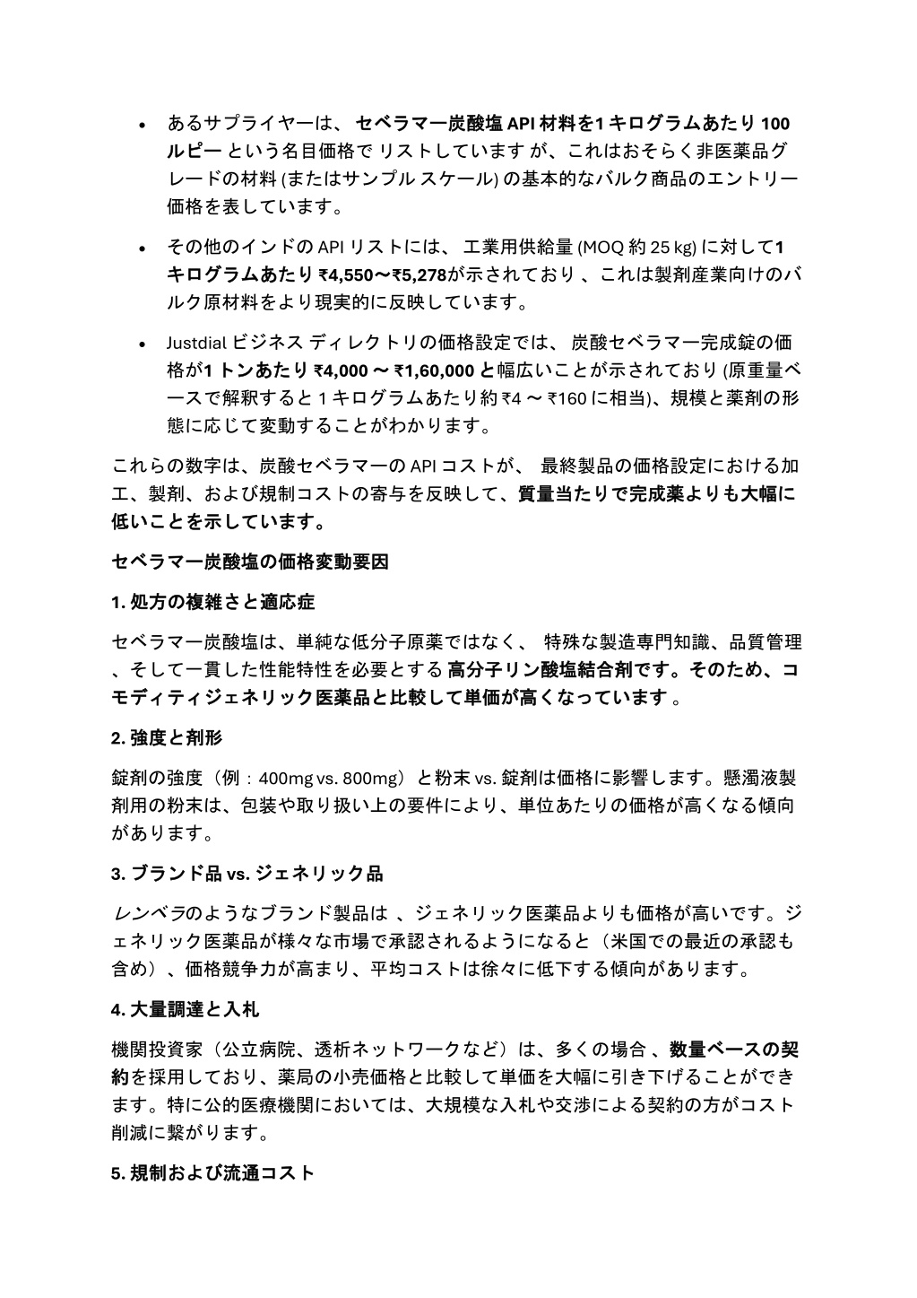 •あるサプライヤーは、セベラマー ルピー ルピーという名目価格でリストしていますが、これはおそらく非医薬品グ レードの材料 (またはサンプルスケール) の基本的なバルク商品のエントリー 価格を表しています。 炭酸塩 API 材料 を1 キログラム キログラムあたり あたり 100 セベラマー炭酸塩 材料を •その他のインドの API リストには、工業用供給量 (MOQ 約 25 kg) に対して1 キログラム キログラムあたり あたり ₹4,550~ ~₹5,278が示されており、これは製剤産業向けのバ ルク原材料をより現実的に反映しています。 •Justdial ビジネスディレクトリの価格設定では、炭酸セベラマー完成錠の価 格が1 トン トンあたり あたり ₹4,000 ~ ~ ₹1,60,000 と ースで解釈すると 1 キログラムあたり約 ₹4 ~ ₹160 に相当)、規模と薬剤の形 態に応じて変動することがわかります。 と幅広いことが示されており(原重量ベ これらの数字は、炭酸セベラマーの API コストが、最終製品の価格設定における加 工、製剤、および規制コストの寄与を反映して、質量当 しています。 質量当たりで たりで完成薬 完成薬よりも よりも大幅 大幅に に 低 低いことを いことを示 示しています。 の価格変動要因 価格変動要因 セベラマー セベラマー炭酸塩 炭酸塩の 1. 処方 処方の さと適応症 適応症 の複雑 複雑さと セベラマー炭酸塩は、単純な低分子原薬ではなく、特殊な製造専門知識、品質管理 、そして一貫した性能特性を必要とする高分子 高分子リン モディティジェネリック モディティジェネリック医薬品 医薬品と と比較 比較して して単価 リン酸塩結合剤 酸塩結合剤です。そのため、 です。そのため、コ くなっています。 コ 単価が が高 高くなっています 2. 強度 強度と と剤形 剤形 錠剤の強度(例:400mg vs. 800mg)と粉末 vs. 錠剤は価格に影響します。懸濁液製 剤用の粉末は、包装や取り扱い上の要件により、単位あたりの価格が高くなる傾向 があります。 3. ブランド ブランド品 品 vs. ジェネリック ジェネリック品 品 レンベラのようなブランド製品は、ジェネリック医薬品よりも価格が高いです。ジ ェネリック医薬品が様々な市場で承認されるようになると(米国での最近の承認も 含め)、価格競争力が高まり、平均コストは徐々に低下する傾向があります。 4. 大量調達 大量調達と と入札 入札 機関投資家(公立病院、透析ネットワークなど)は、多くの場合、数量 約 約を採用しており、薬局の小売価格と比較して単価を大幅に引き下げることができ 数量ベース ベースの の契 契 ます。特に公的医療機関においては、大規模な入札や交渉による契約の方がコスト 削減に繋がります。 5. 規制 規制および 流通コスト コスト および流通