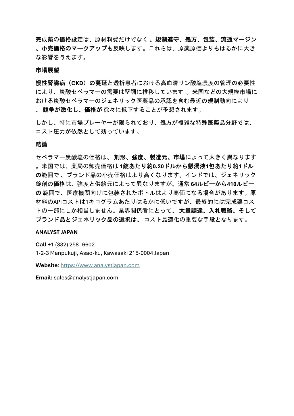 完成薬の価格設定は、原材料費だけでなく、規制遵守、処方、包装、流通完成薬の価格設定は、原材料費だけでなく、規制遵守、処方、包装、流通 、小売価格 、小売価格の のマークアップ マークアップも反映します。これらは、原薬原価よりもはるかに大き な影響を与えます。 、規制遵守、処方、包装、流通マージン マージン 市場展望 市場展望 慢性腎臓病( 慢性腎臓病(CKD)の により、炭酸セベラマーの需要は堅調に推移しています。米国などの大規模市場に おける炭酸セベラマーのジェネリック医薬品の承認を含む最近の規制動向により 、競争 競争が が激化 激化し、 し、価格 価格が が徐々に低下することが予想されます。 )の蔓延 蔓延と透析患者における高血清リン酸塩濃度の管理の必要性 しかし、特に市場プレーヤーが限られており、処方が複雑な特殊医薬品分野では、 コスト圧力が依然として残っています。 結論 結論 セベラマー炭酸塩の価格は、剤形、強度、製造元、市場 。米国では、薬局の卸売価格は1錠 の の範囲で、ブランド品の小売価格はより高くなります。インドでは、ジェネリック 錠剤の価格は、強度と供給元によって異なりますが、通常64ルピー の の範囲で、医療機関向けに包装されたボトルはより高価になる場合があります。原 材料のAPIコストは1キログラムあたりはるかに低いですが、最終的には完成薬コス トの一部にしか相当しません。業界関係者にとって、大量調達、入札戦略、 ブランド ブランド品 品と とジェネリック ジェネリック品 品の の選択 選択は、 は、コスト最適化の重要な手段となります。 剤形、強度、製造元、市場によって大きく異なります 約0.20ドル ドルから から懸濁液 懸濁液1包 約1ドル ドル 錠あたり あたり約 包あたり あたり約 から410ルピー ルピーから ルピー 大量調達、入札戦略、そして そして ANALYST JAPAN Call+1 (332) 258- 6602 1-2-3 Manpukuji, Asao-ku, Kawasaki 215-0004 Japan Website:https://www.analystjapan.com Email:sales@analystjapan.com