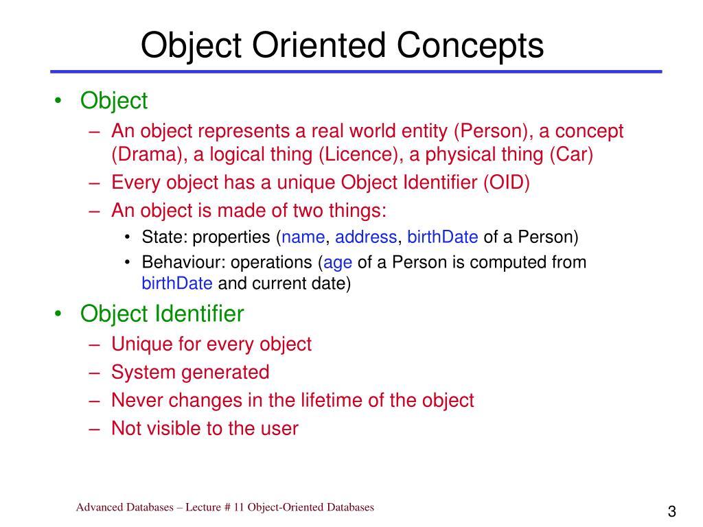 Object Oriented Concepts • Object • An object represents a real world entity (Person), a concept (Drama), a logical thing (Licence), a physical thing (Car) • Every object has a unique Object Identifier (OID) • An object is made of two things: • State: properties (name, address, birthDate of a Person) • Behaviour: operations (age of a Person is computed from birthDate and current date) • Object Identifier • Unique for every object • System generated • Never changes in the lifetime of the object • Not visible to the user