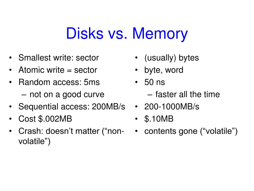 Smallest write: sector Atomic write = sector Random access: 5ms not on a good curve Sequential access: 200MB/s Cost $.002MB Crash: doesn’t matter (“non-volatile”) Disks vs. Memory • (usually) bytes • byte, word • 50 ns • faster all the time • 200-1000MB/s • $.10MB • contents gone (“volatile”)