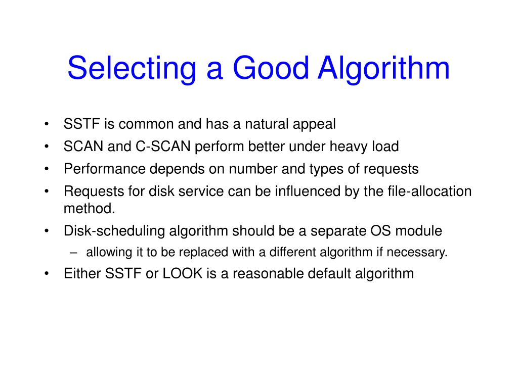 Selecting a Good Algorithm • SSTF is common and has a natural appeal • SCAN and C-SCAN perform better under heavy load • Performance depends on number and types of requests • Requests for disk service can be influenced by the file-allocation method. • Disk-scheduling algorithm should be a separate OS module • allowing it to be replaced with a different algorithm if necessary. • Either SSTF or LOOK is a reasonable default algorithm
