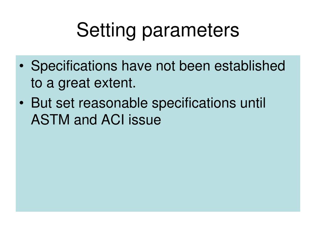 Setting parameters • Specifications have not been established to a great extent. • But set reasonable specifications until ASTM and ACI issue