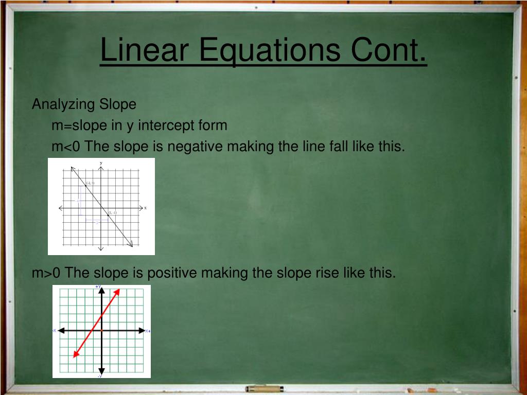 Linear Equations Cont. Analyzing Slope m=slope in y intercept form m<0 The slope is negative making the line fall like this. m>0 The slope is positive making the slope rise like this.