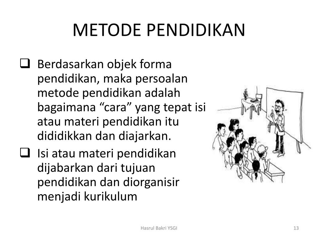 METODE PENDIDIKAN • Berdasarkanobjek forma pendidikan, makapersoalanmetodependidikanadalahbagaimana “cara” yang tepatisiataumateripendidikanitudididikkandandiajarkan. • Isiataumateripendidikandijabarkandaritujuanpendidikandandiorganisirmenjadikurikulum Hasrul Bakri YSGI