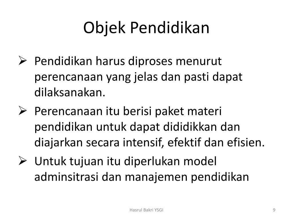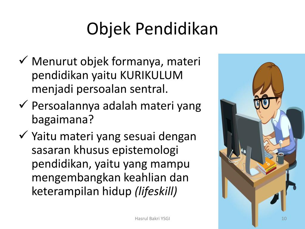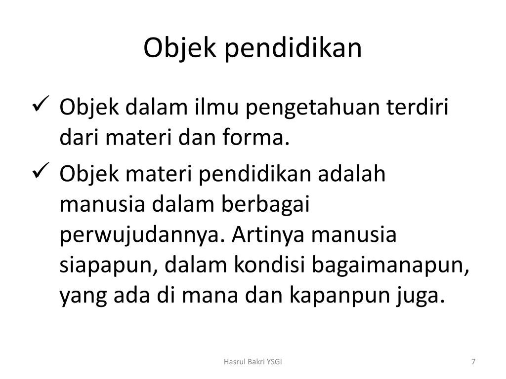 Objekpendidikan • Objekdalamilmupengetahuanterdiridarimateridan forma. • Objekmateripendidikanadalahmanusiadalamberbagaiperwujudannya. Artinyamanusiasiapapun, dalamkondisibagaimanapun, yang adadimanadankapanpunjuga. Hasrul Bakri YSGI