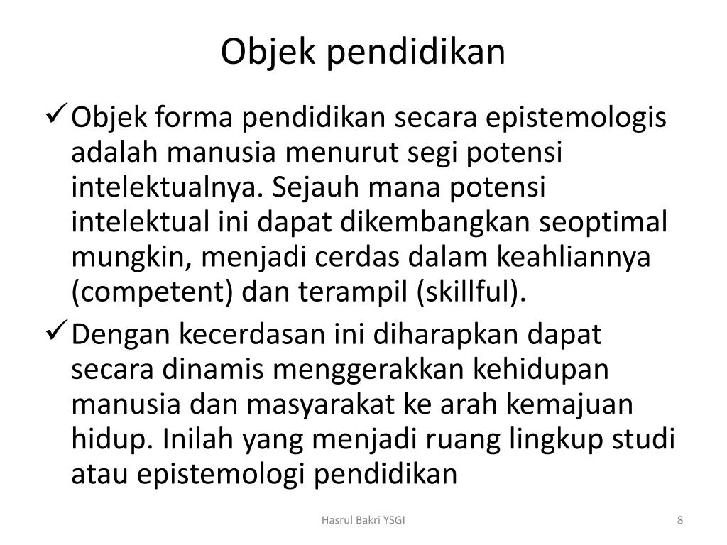 Objekpendidikan • Objek forma pendidikansecaraepistemologisadalahmanusiamenurutsegipotensiintelektualnya. Sejauhmanapotensiintelektualinidapatdikembangkanseoptimalmungkin, menjadicerdasdalamkeahliannya (competent) danterampil (skillful). • Dengankecerdasaninidiharapkandapatsecaradinamismenggerakkankehidupanmanusiadanmasyarakatkearahkemajuanhidup. Inilah yang menjadiruanglingkupstudiatauepistemologipendidikan Hasrul Bakri YSGI