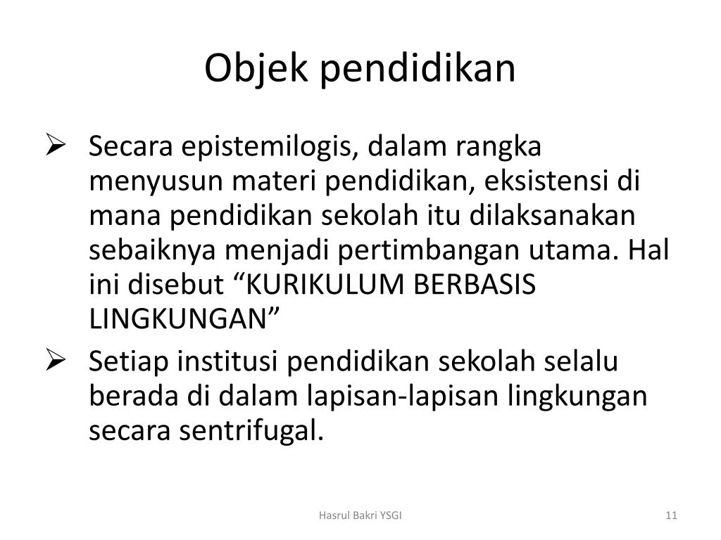 Objekpendidikan • Secaraepistemilogis, dalamrangkamenyusunmateripendidikan, eksistensidimanapendidikansekolahitudilaksanakansebaiknyamenjadipertimbanganutama. Hal inidisebut “KURIKULUM BERBASIS LINGKUNGAN” • Setiapinstitusipendidikansekolahselaluberadadidalamlapisan-lapisanlingkungansecarasentrifugal. Hasrul Bakri YSGI
