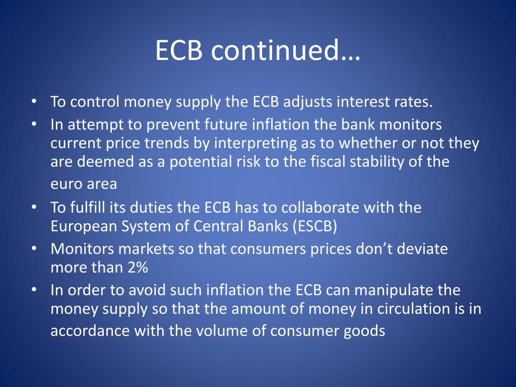 ECB continued… • To control money supply the ECB adjusts interest rates. • In attempt to prevent future inflation the bank monitors current price trends by interpreting as to whether or not they are deemed as a potential risk to the fiscal stability of the euro area • To fulfill its duties the ECB has to collaborate with the European System of Central Banks (ESCB) • Monitors markets so that consumers prices don’t deviate more than 2% • In order to avoid such inflation the ECB can manipulate the money supply so that the amount of money in circulation is in accordance with the volume of consumer goods