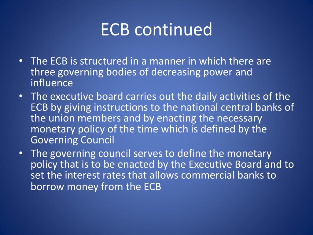 ECB continued • The ECB is structured in a manner in which there are three governing bodies of decreasing power and influence • The executive board carries out the daily activities of the ECB by giving instructions to the national central banks of the union members and by enacting the necessary monetary policy of the time which is defined by the Governing Council • The governing council serves to define the monetary policy that is to be enacted by the Executive Board and to set the interest rates that allows commercial banks to borrow money from the ECB