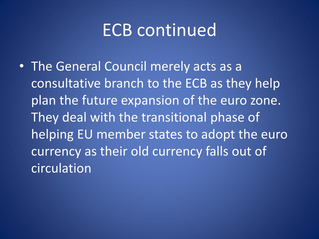 ECB continued • The General Council merely acts as a consultative branch to the ECB as they help plan the future expansion of the euro zone. They deal with the transitional phase of helping EU member states to adopt the euro currency as their old currency falls out of circulation