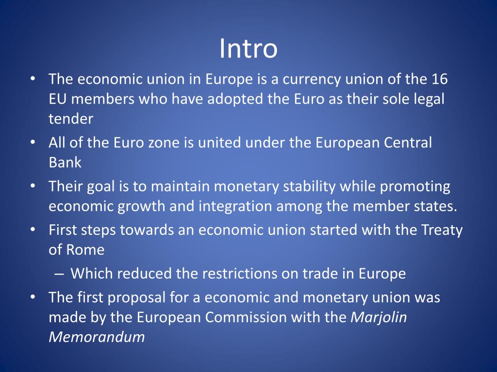 Intro • The economic union in Europe is a currency union of the 16 EU members who have adopted the Euro as their sole legal tender • All of the Euro zone is united under the European Central Bank • Their goal is to maintain monetary stability while promoting economic growth and integration among the member states. • First steps towards an economic union started with the Treaty of Rome • Which reduced the restrictions on trade in Europe • The first proposal for a economic and monetary union was made by the European Commission with the Marjolin Memorandum