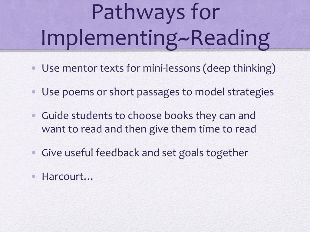 Pathways for Implementing~Reading • Use mentor texts for mini-lessons (deep thinking) • Use poems or short passages to model strategies • Guide students to choose books they can and want to read and then give them time to read • Give useful feedback and set goals together • Harcourt…