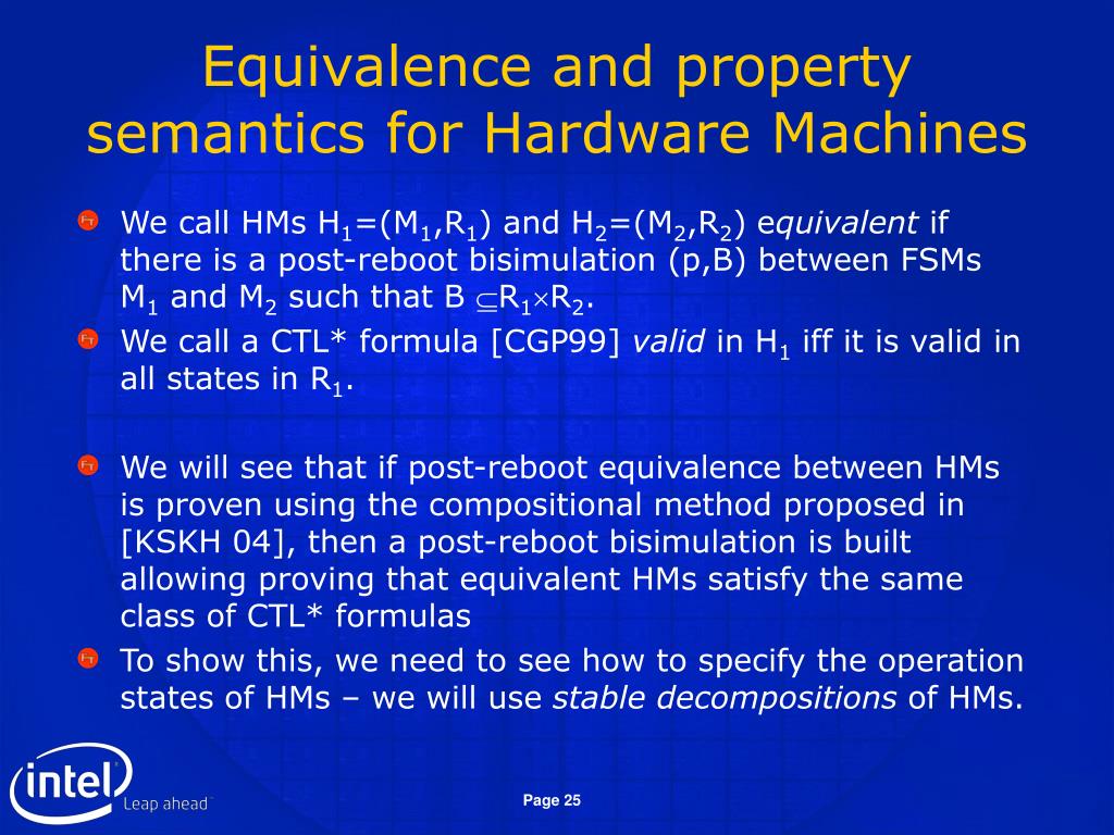 Equivalence and property semantics for Hardware Machines • We call HMs H1=(M1,R1) and H2=(M2,R2) equivalent if there is a post-reboot bisimulation (p,B) between FSMs M1 and M2 such that B R1R2. • We call a CTL* formula [CGP99] valid in H1 iff it is valid in all states in R1. • We will see that if post-reboot equivalence between HMs is proven using the compositional method proposed in [KSKH 04], then a post-reboot bisimulation is built allowing proving that equivalent HMs satisfy the same class of CTL* formulas • To show this, we need to see how to specify the operation states of HMs – we will use stable decompositions of HMs.
