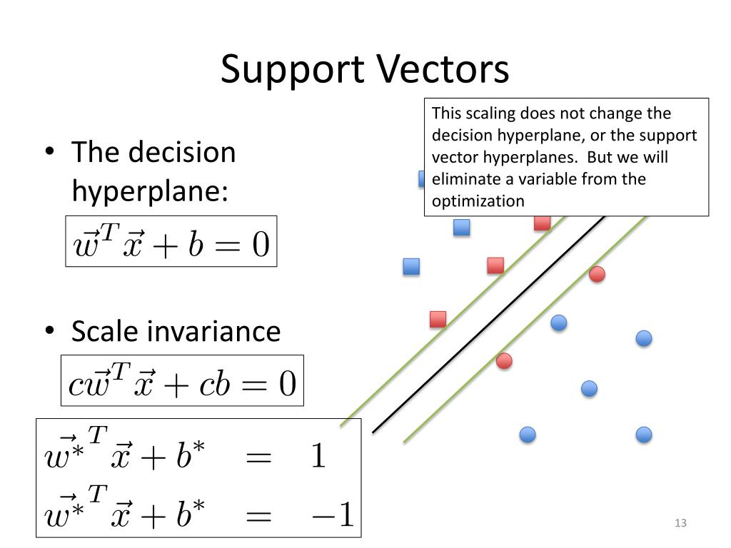Support Vectors This scaling does not change the decision hyperplane, or the support vector hyperplanes. But we will eliminate a variable from the optimization • The decision hyperplane: • Scale invariance