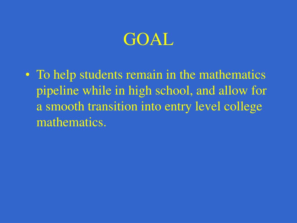 GOAL • To help students remain in the mathematics pipeline while in high school, and allow for a smooth transition into entry level college mathematics.