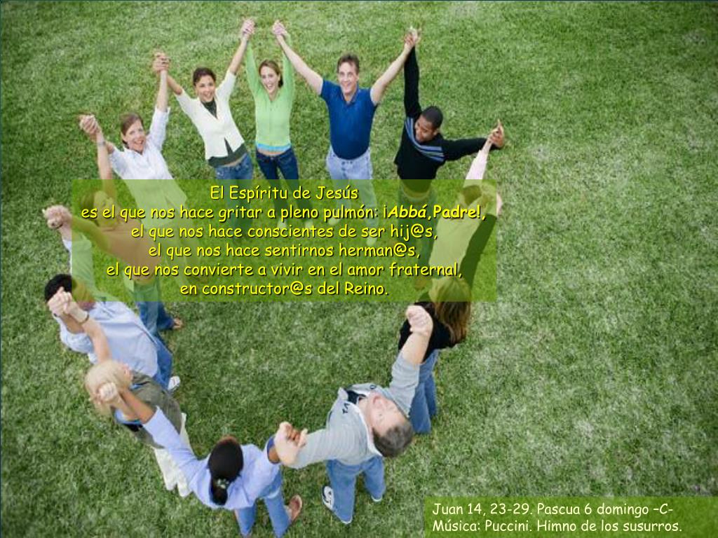 El Espíritu de Jesús es el que nos hace gritar a pleno pulmón: ¡Abbá,Padre!, el que nos hace conscientes de ser hij@s, el que nos hace sentirnos herman@s,el que nos convierte a vivir en el amor fraternal, en constructor@s del Reino. Juan 14, 23-29. Pascua 6 domingo –C- Música: Puccini. Himno de los susurros.