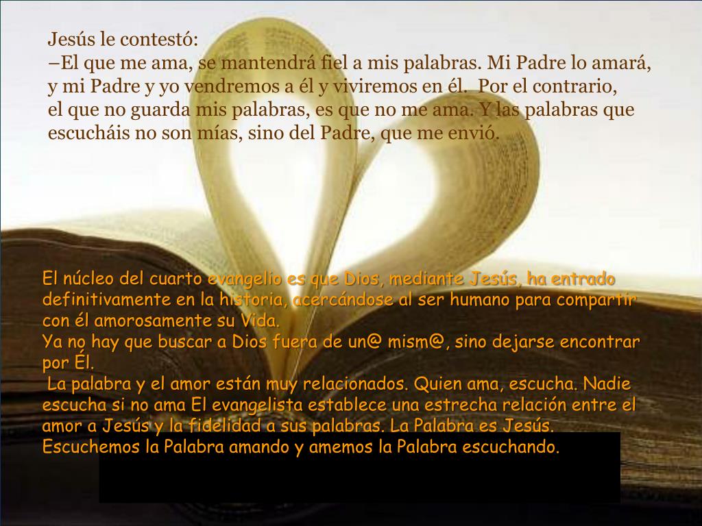 Jesús le contestó:–El que me ama, se mantendrá fiel a mis palabras. Mi Padre lo amará, y mi Padre y yo vendremos a él y viviremos en él. Por el contrario, el que no guarda mis palabras, es que no me ama. Y las palabras que escucháis no son mías, sino del Padre, que me envió. El núcleo del cuarto evangelio es que Dios, mediante Jesús, ha entrado definitivamente en la historia, acercándose al ser humano para compartir con él amorosamente su Vida. Ya no hay que buscar a Dios fuera de un@mism@, sino dejarse encontrar por Él. La palabra y el amor están muy relacionados. Quien ama, escucha. Nadie escucha si no ama El evangelista establece una estrecha relación entre el amor a Jesús y la fidelidad a sus palabras. La Palabra es Jesús. Escuchemos la Palabra amando y amemos la Palabra escuchando.