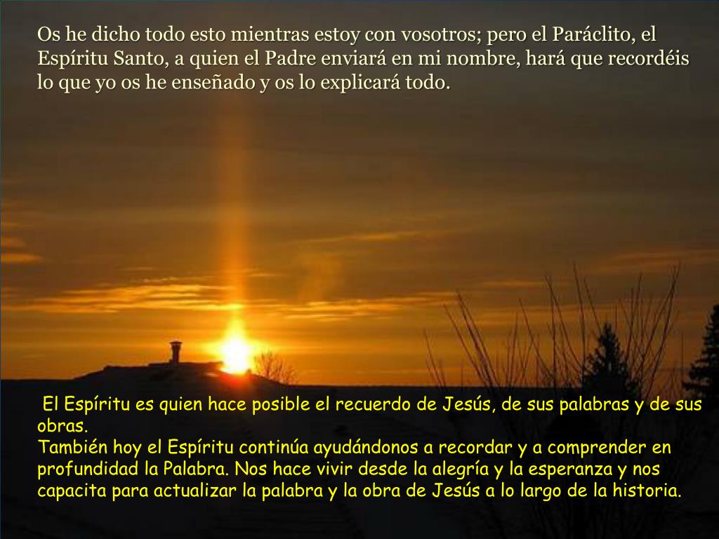 Os he dicho todo esto mientras estoy con vosotros; pero el Paráclito, el Espíritu Santo, a quien el Padre enviará en mi nombre, hará que recordéis lo que yo os he enseñado y os lo explicará todo. El Espíritu es quien hace posible el recuerdo de Jesús, de sus palabras y de sus obras. También hoy el Espíritu continúa ayudándonos a recordar y a comprender en profundidad la Palabra. Nos hace vivir desde la alegría y la esperanza y nos capacita para actualizar la palabra y la obra de Jesús a lo largo de la historia.
