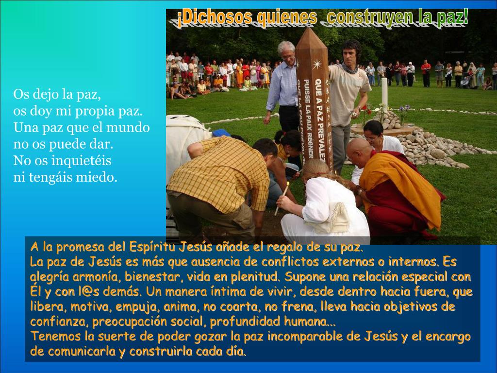¡Dichosos quienes construyen la paz! Os dejo la paz, os doy mi propia paz. Una paz que el mundo no os puede dar. No os inquietéis ni tengáis miedo. A la promesa del Espíritu Jesús añade el regalo de su paz. La paz de Jesús es más que ausencia de conflictos externos o internos. Es alegría armonía, bienestar, vida en plenitud. Supone una relación especial con Él y con l@s demás. Un manera íntima de vivir, desde dentro hacia fuera, que libera, motiva, empuja, anima, no coarta, no frena, lleva hacia objetivos de confianza, preocupación social, profundidad humana... Tenemos la suerte de poder gozar la paz incomparable de Jesús y el encargo de comunicarla y construirla cada día.