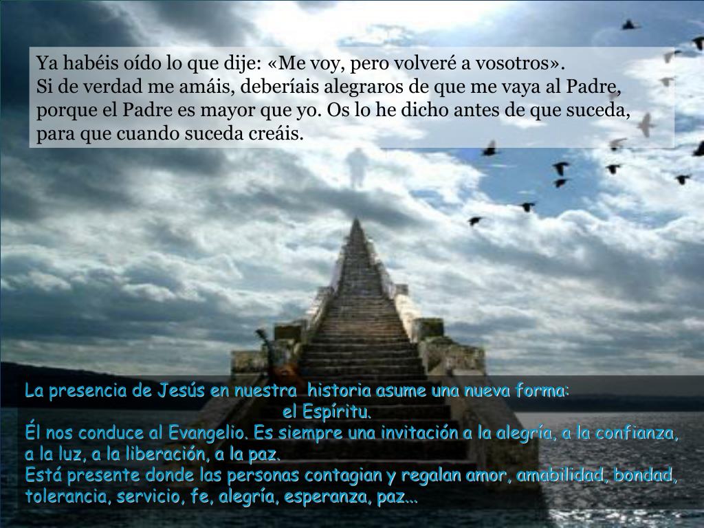 Ya habéis oído lo que dije: «Me voy, pero volveré a vosotros». Si de verdad me amáis, deberíais alegraros de que me vaya al Padre, porque el Padre es mayor que yo. Os lo he dicho antes de que suceda, para que cuando suceda creáis. La presencia de Jesús en nuestra historia asume una nueva forma: el Espíritu. Él nos conduce al Evangelio. Es siempre una invitación a la alegría, a la confianza, a la luz, a la liberación, a la paz. Está presente donde las personas contagian y regalan amor, amabilidad, bondad, tolerancia, servicio, fe, alegría, esperanza, paz...