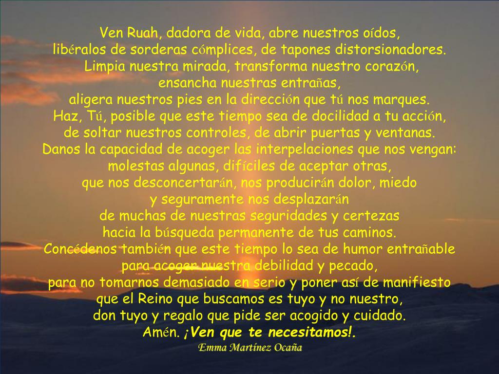Ven Ruah, dadora de vida, abre nuestros oídos, libéralos de sorderas cómplices, de tapones distorsionadores. Limpia nuestra mirada, transforma nuestro corazón, ensancha nuestras entrañas, aligera nuestros pies en la dirección que tú nos marques. Haz, Tú, posible que este tiempo sea de docilidad a tu acción, de soltar nuestros controles, de abrir puertas y ventanas. Danos la capacidad de acoger las interpelaciones que nos vengan: molestas algunas, difíciles de aceptar otras, que nos desconcertarán, nos producirán dolor, miedo y seguramente nos desplazarán de muchas de nuestras seguridades y certezas hacia la búsqueda permanente de tus caminos. Concédenos también que este tiempo lo sea de humor entrañable para acoger nuestra debilidad y pecado, para no tomarnos demasiado en serio y poner así de manifiesto que el Reino que buscamos es tuyo y no nuestro, don tuyo y regalo que pide ser acogido y cuidado. Amén. ¡Ven que te necesitamos!. Emma Martínez Ocaña