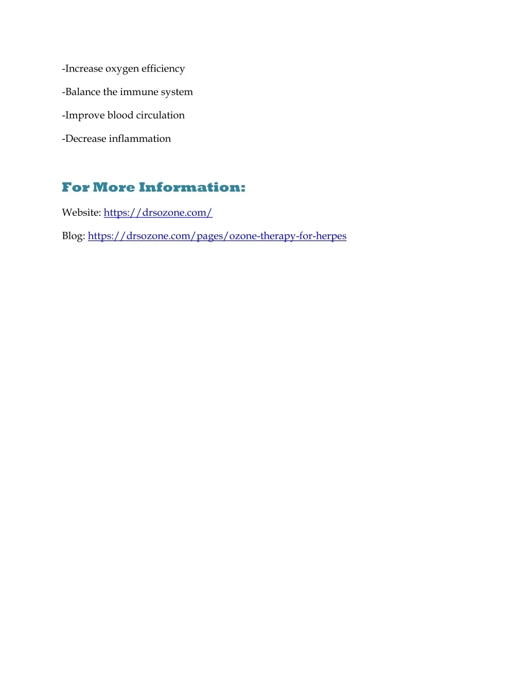 -Increase oxygen efficiency -Balance the immune system -Improve blood circulation -Decrease inflammation For More Information: Website: https://drsozone.com/ Blog: https://drsozone.com/pages/ozone-therapy-for-herpes