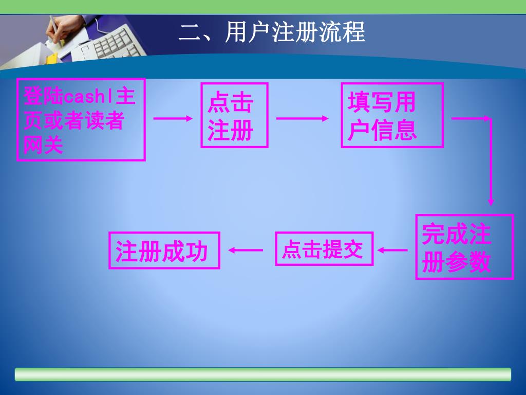 二、用户注册流程 登陆cashl主页或者读者网关 点击注册 填写用户信息 完成注册参数 注册成功 点击提交