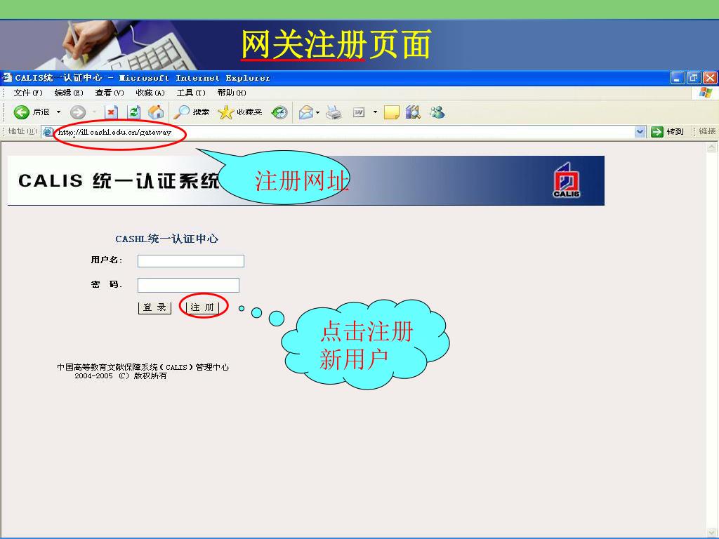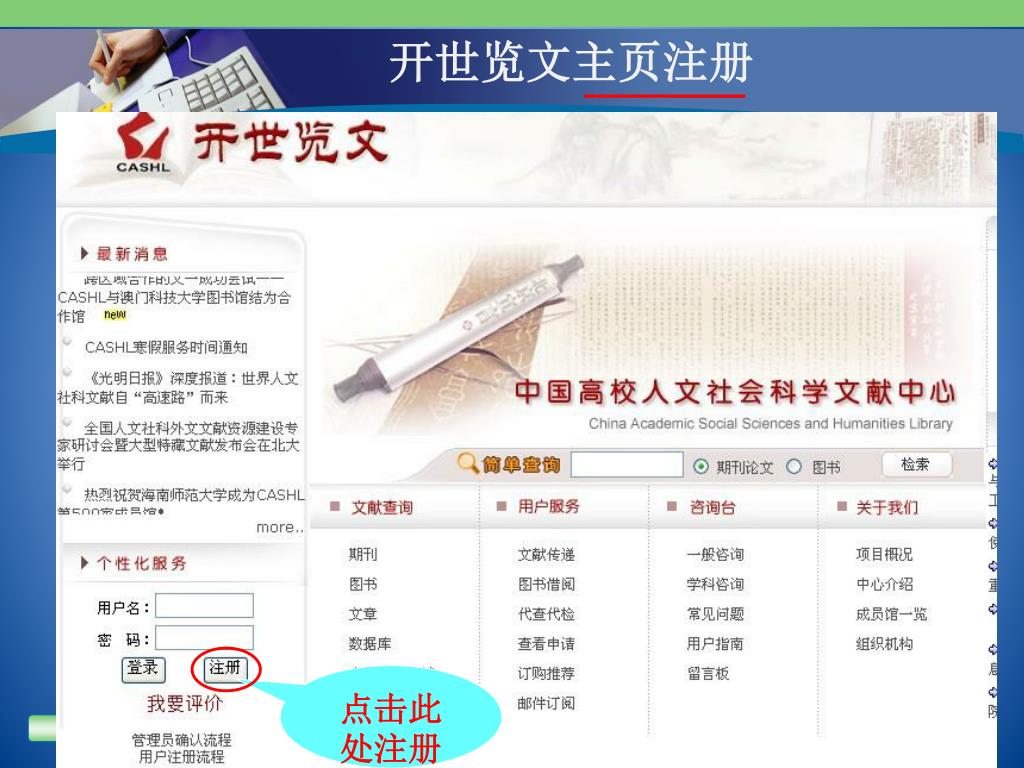 具体步骤: 登录开世览文主页(http://www.cashl.edu.cn) 或网关(http://ill.cashl.edu.cn/gateway/) 点击“注册”