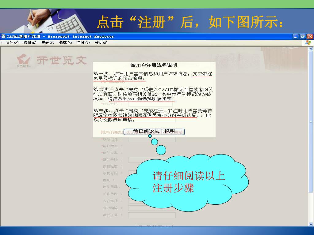 帐户注册成功,请您记住有关注册信息,同时持一卡通和工作证(学生证)到图书馆六楼办公室进行确认,成为CASHL合法用户。帐户注册成功,请您记住有关注册信息,同时持一卡通和工作证(学生证)到图书馆六楼办公室进行确认,成为CASHL合法用户。