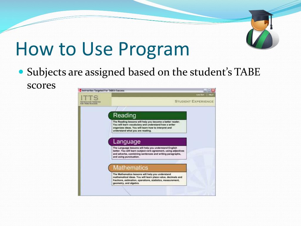 How to Use Program • Subjects are assigned based on the student’s TABE scores