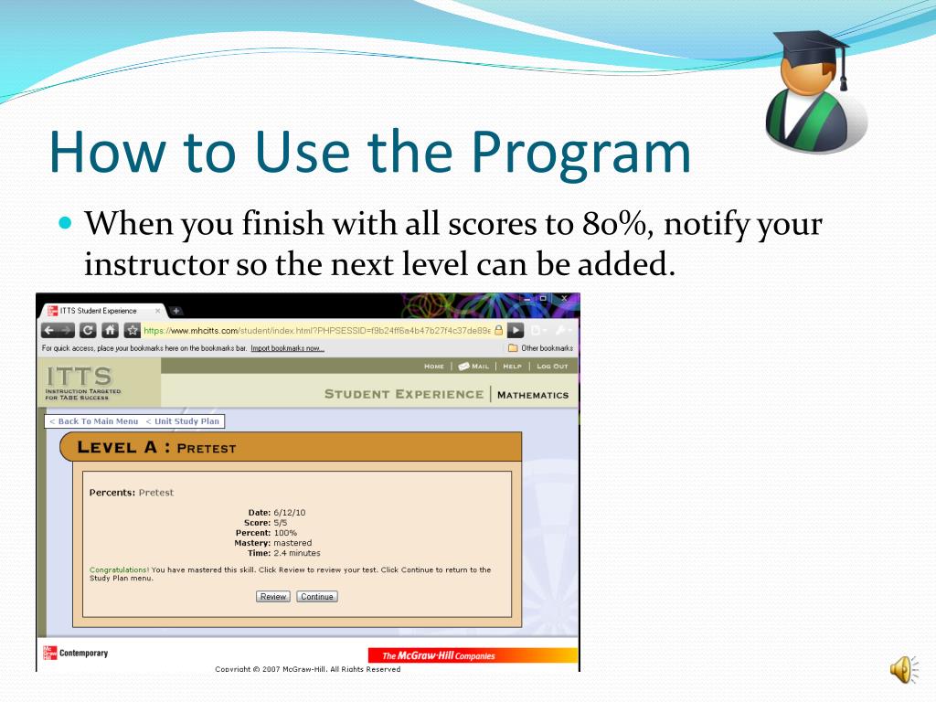How to Use the Program • When you finish with all scores to 80%, notify your instructor so the next level can be added.
