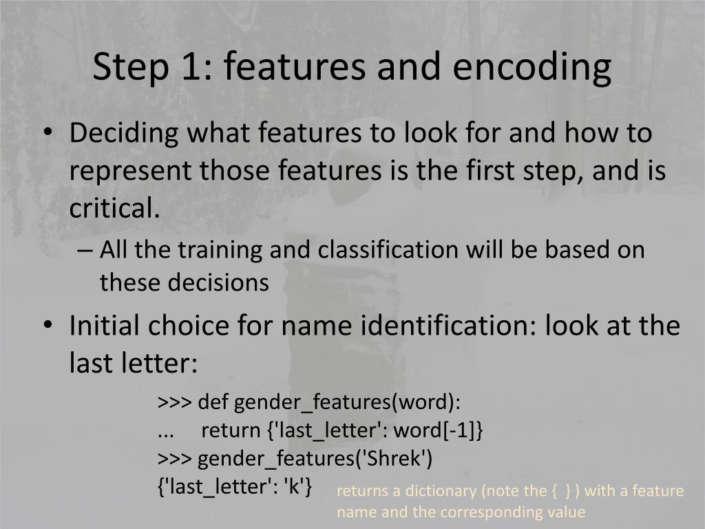 Step 1: features and encoding • Deciding what features to look for and how to represent those features is the first step, and is critical. • All the training and classification will be based on these decisions • Initial choice for name identification: look at the last letter: >>> def gender_features(word): ... return {'last_letter': word[-1]} >>> gender_features('Shrek') {'last_letter': 'k'} returns a dictionary (note the { } ) with a feature name and the corresponding value